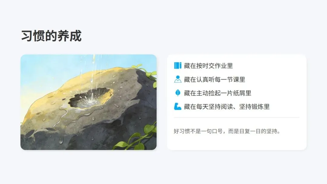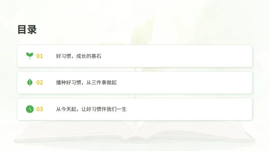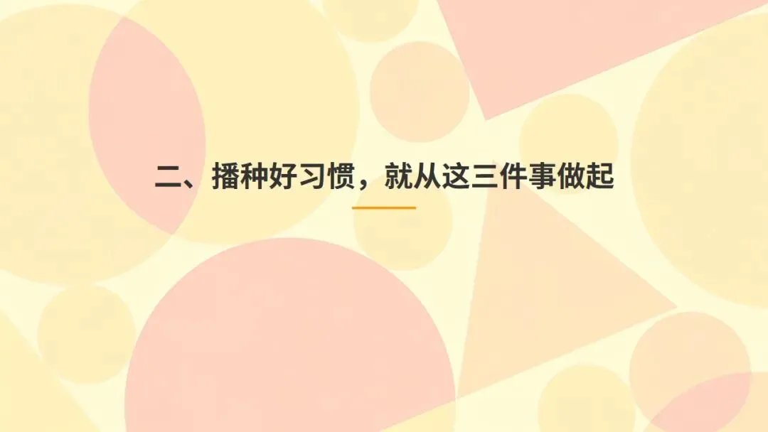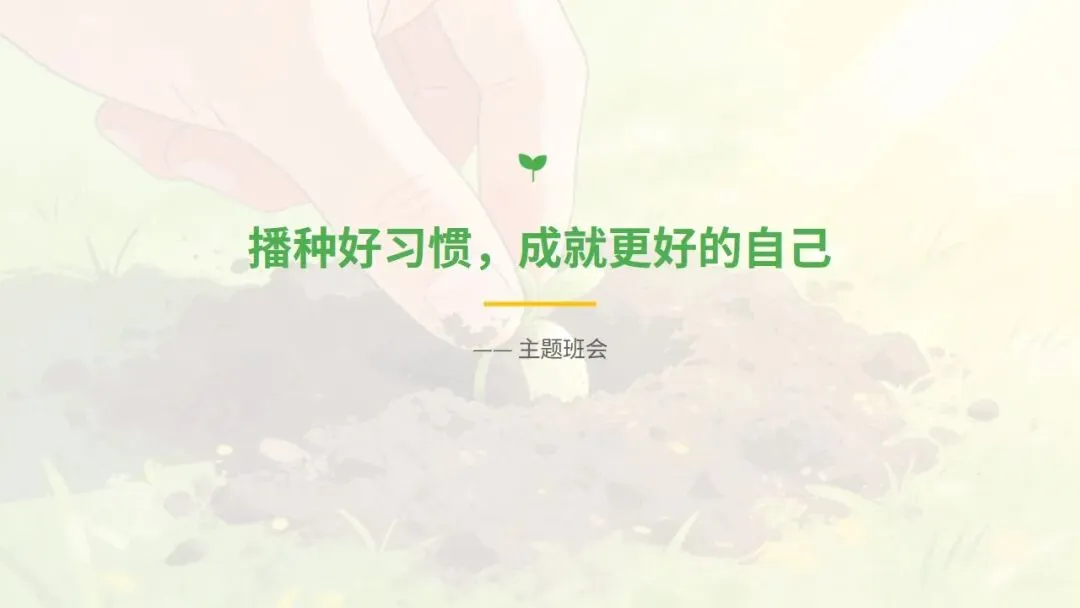 好习惯不是一蹴而就的,而是需要长期坚持的。它藏在按时交作业里,藏在认真听每一节课里,藏在主动捡起一片纸屑里,藏在每天坚持阅读、坚持锻炼里。让我们从现在做起,珍惜当下,不等待、不拖延;从小事做起,注重细节,不马虎、不松懈;从自己做起,严于律己,严格要求、互相监督。播种一种行为,收获一种习惯;播种一种习惯,收获一种性格;播种一种性格,收获一种命运。愿我们从今天起,用心播种好习惯,用行动收获好未来!如需主题班会《播种好习惯,成就更好的自己》28页PPT课件+3400字逐页发言稿完整电子版,点这里👇: