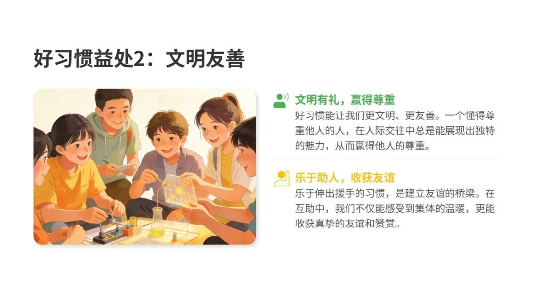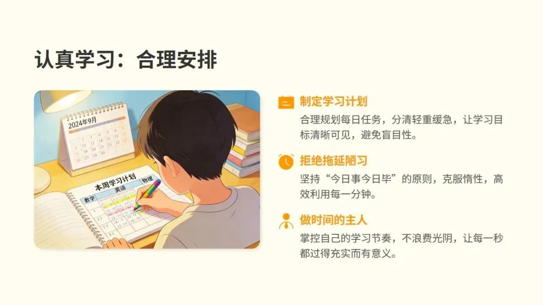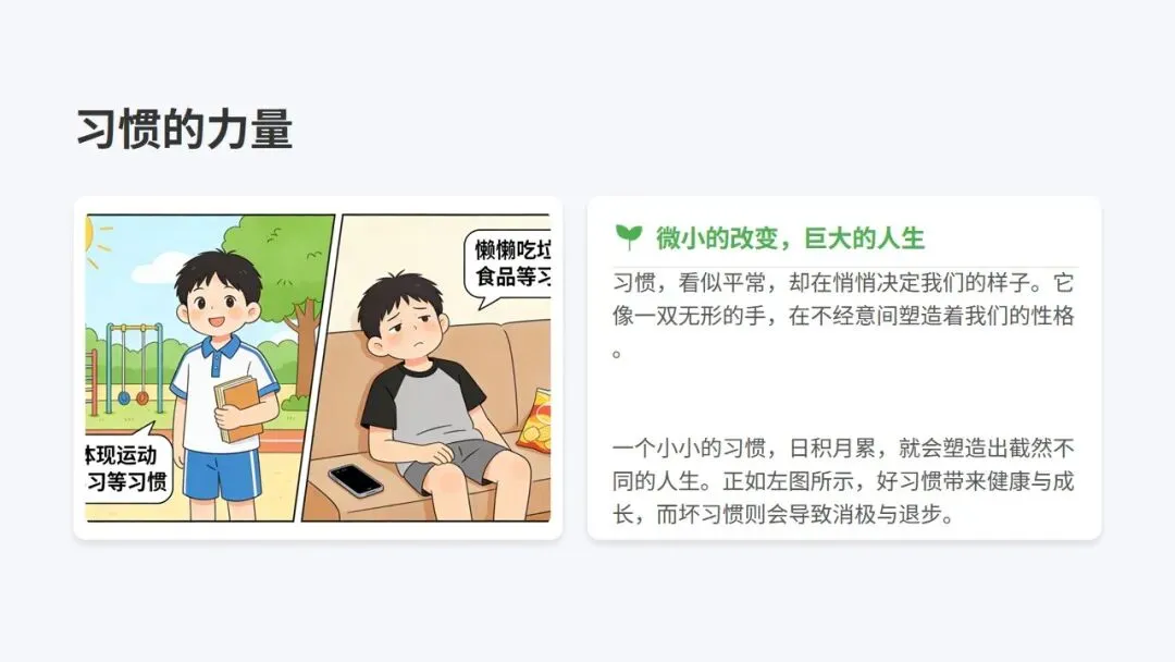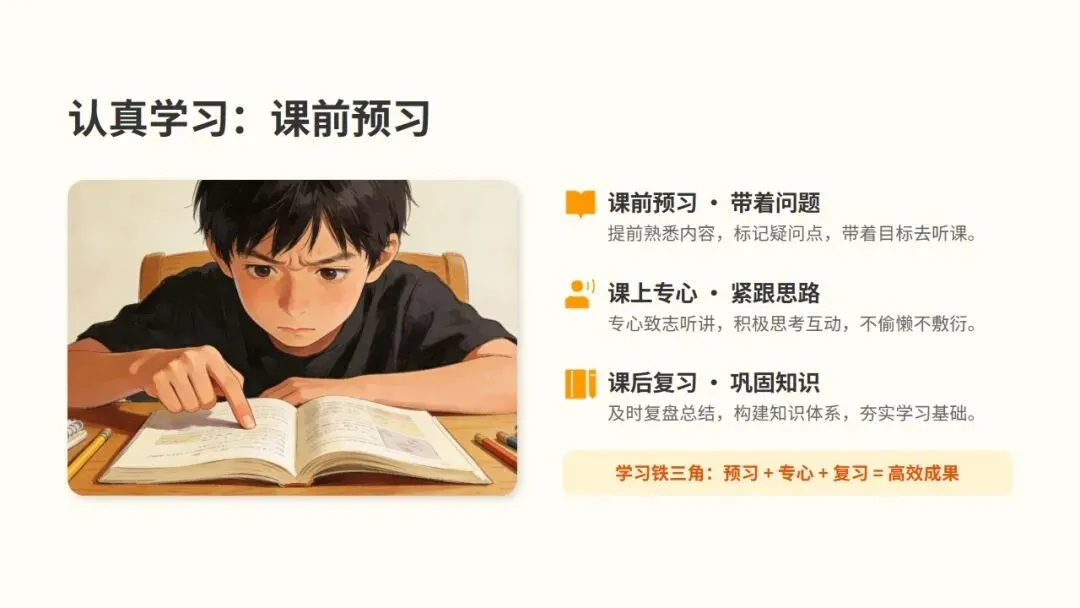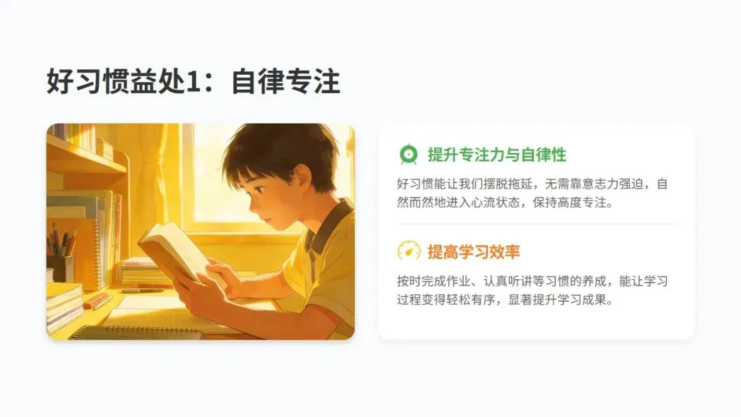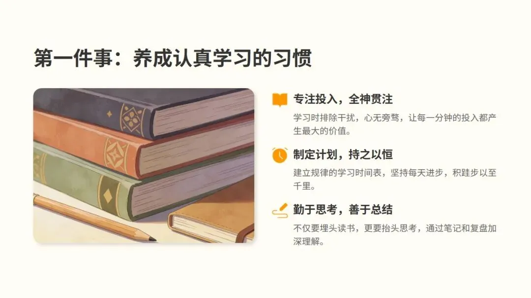 小学与中学阶段,是人生中养成良好习惯的黄金窗口期。这个时期的习惯,将成为未来的基石。今天的一个小习惯,明天就会变成大能力;今天的每一份坚持,终将转化为你未来的核心优势。好习惯能带来自律专注。它能让我们摆脱拖延,无需靠意志力强迫,自然而然地进入心流状态,保持高度专注。按时完成作业、认真听讲等习惯的养成,能让学习过程变得轻松有序,显著提升学习成果。好习惯还能让我们文明友善。一个懂得尊重他人的人,在人际交往中总是能展现出独特的魅力,从而赢得他人的尊重。乐于伸出援手的习惯,是建立友谊的桥梁。在互助中,我们不仅能感受到集体的温暖,更能收获真挚的友谊和赞赏。健康的生活习惯更是人生的基石。早睡早起,保证充足睡眠,让身体得到充分休息,以饱满的精神迎接挑战。均衡摄入营养,多吃蔬果,为身体提供源源不断的能量,打好健康基础。定期运动不仅能增强体质,更能释放压力,培养积极乐观的心态。二、第一步:养成认真学习的习惯