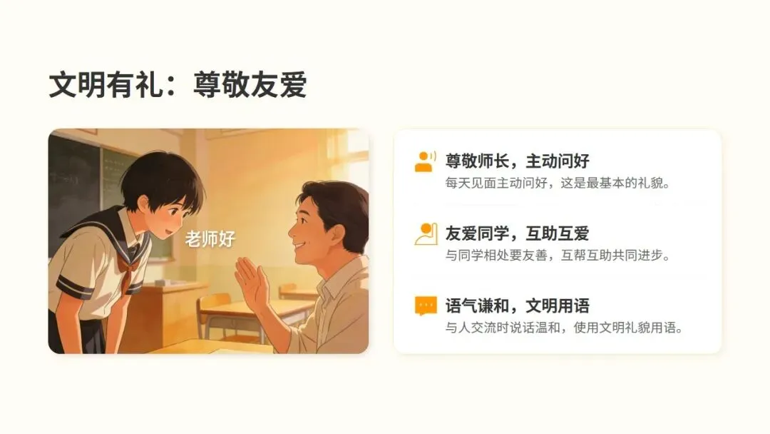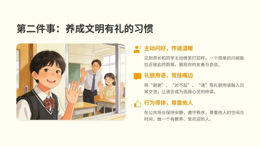 见到师长和同学主动微笑打招呼,一个简单的问候能拉近彼此的距离,展现你的友善与自信。礼貌用语