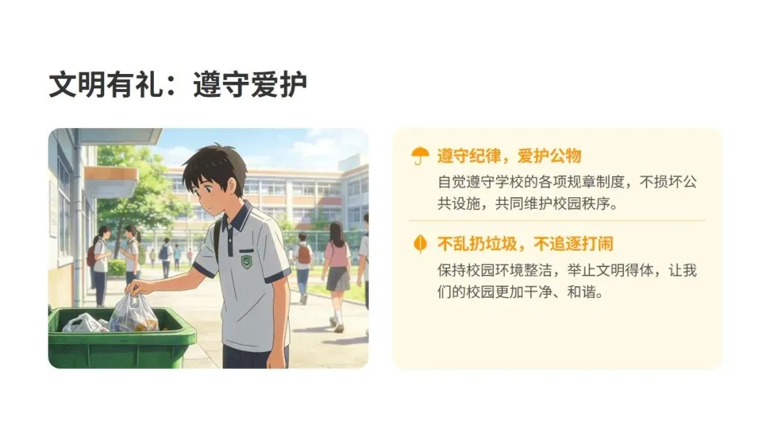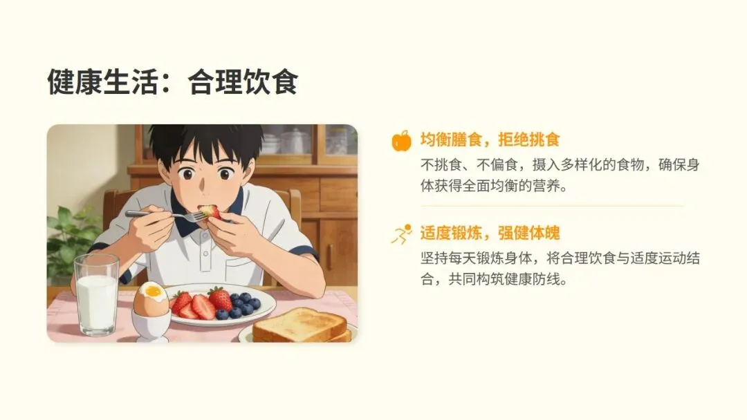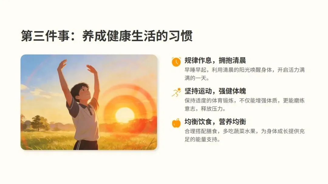 在公共场合保持安静,遵守秩序,尊重他人的空间与时间,做一个有教养、受欢迎的人。尊敬师长,主动问好;友爱同学,互助互爱;语气谦和,文明用语。这些小小的行为,却能让你赢得他人的尊重和喜爱。四、第三步:养成健康生活的习惯