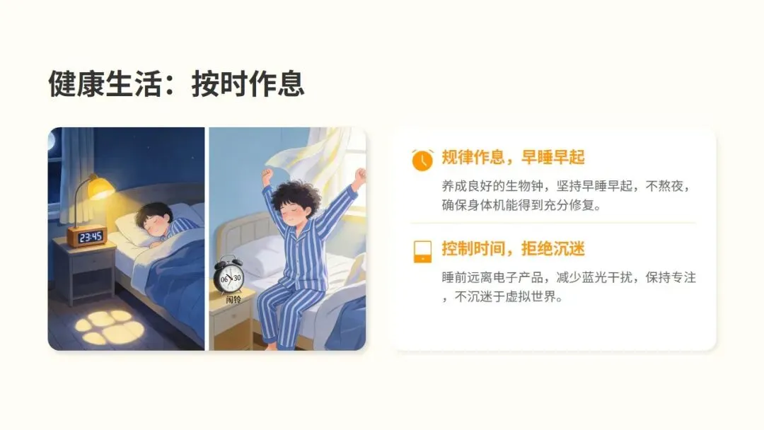早睡早起,保证充足睡眠,让身体得到充分休息,以饱满的精神迎接挑战。睡前远离电子产品,减少蓝光干扰,保持专注,不沉迷于虚拟世界。合理饮食