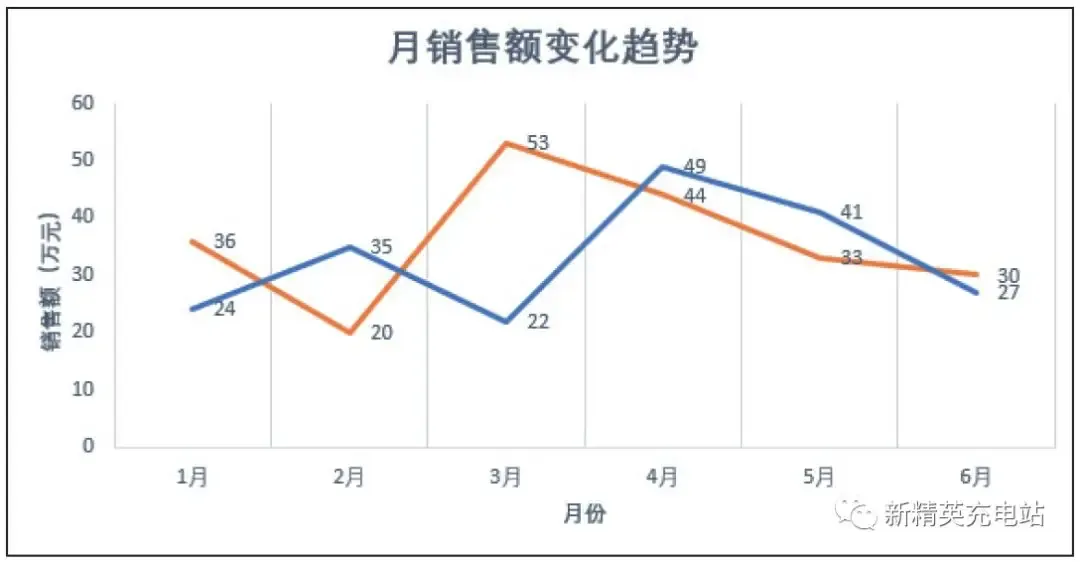 折线图也适合多个二维数据集的比较,如下图所示为两个产品在同一时间内的销售情况比较。