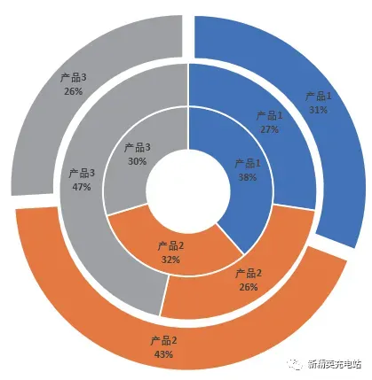 树状图在显示超过两个层级的数据时,基本没有太大的优势。这时就可以使用旭日图。旭日图主要用于展示数据之间的层级和占比关系,从环形内向外,层级逐渐细分,如下图所示。它的好处就是想分多少层都可以。其实,旭日图的功能有些像旧版Excel 中制作的复合环形图,即将几个环形图套在一起,只是旭日图简化了制作过程。