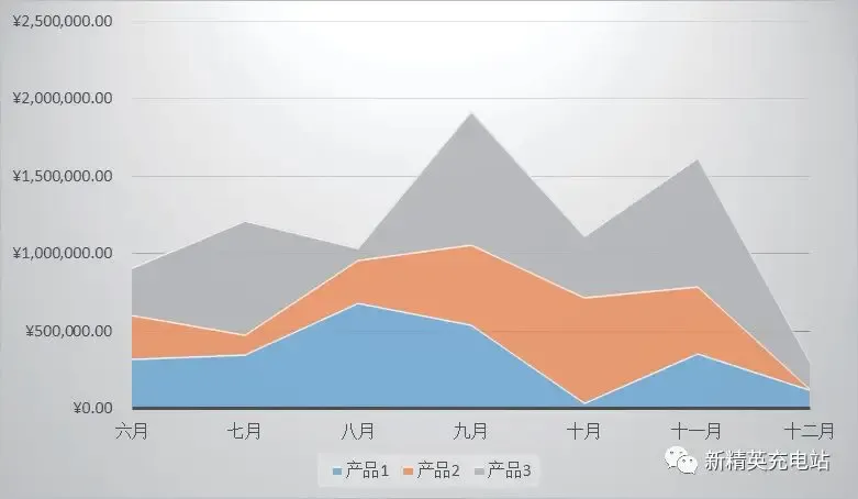 面积图与折线图类似,也可以显示多组数据系列,只是将连线与分类轴之间用图案填充,主要用于表现数据的趋势。但不同的是:折线图只能单纯地反映每个样本的变化趋势,如某产品每个月的变化趋势;而面积图除了可以反映每个样本的变化趋势外,还可以显示总体数据的变化趋势,即面积,如下图所示。
