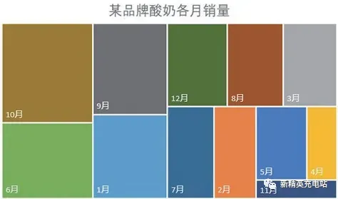 树状图全称为矩形式树状结构图,可以实现层次结构可视化的图表结构,以便用户轻松地发现不同系列之间、不同数据之间的大小关系。如下图所示的图表中,可以清晰看到该酸奶在10 月份的销量最高,其他月份的销量按照方块的大小排列。