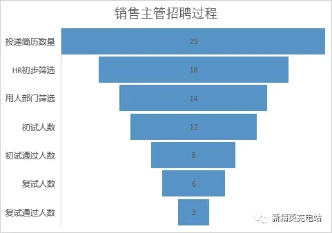 漏斗图通常用于表示销售过程的各个阶段,如下图所示为使用漏斗图对销售主管招聘过程的人数进行展示。