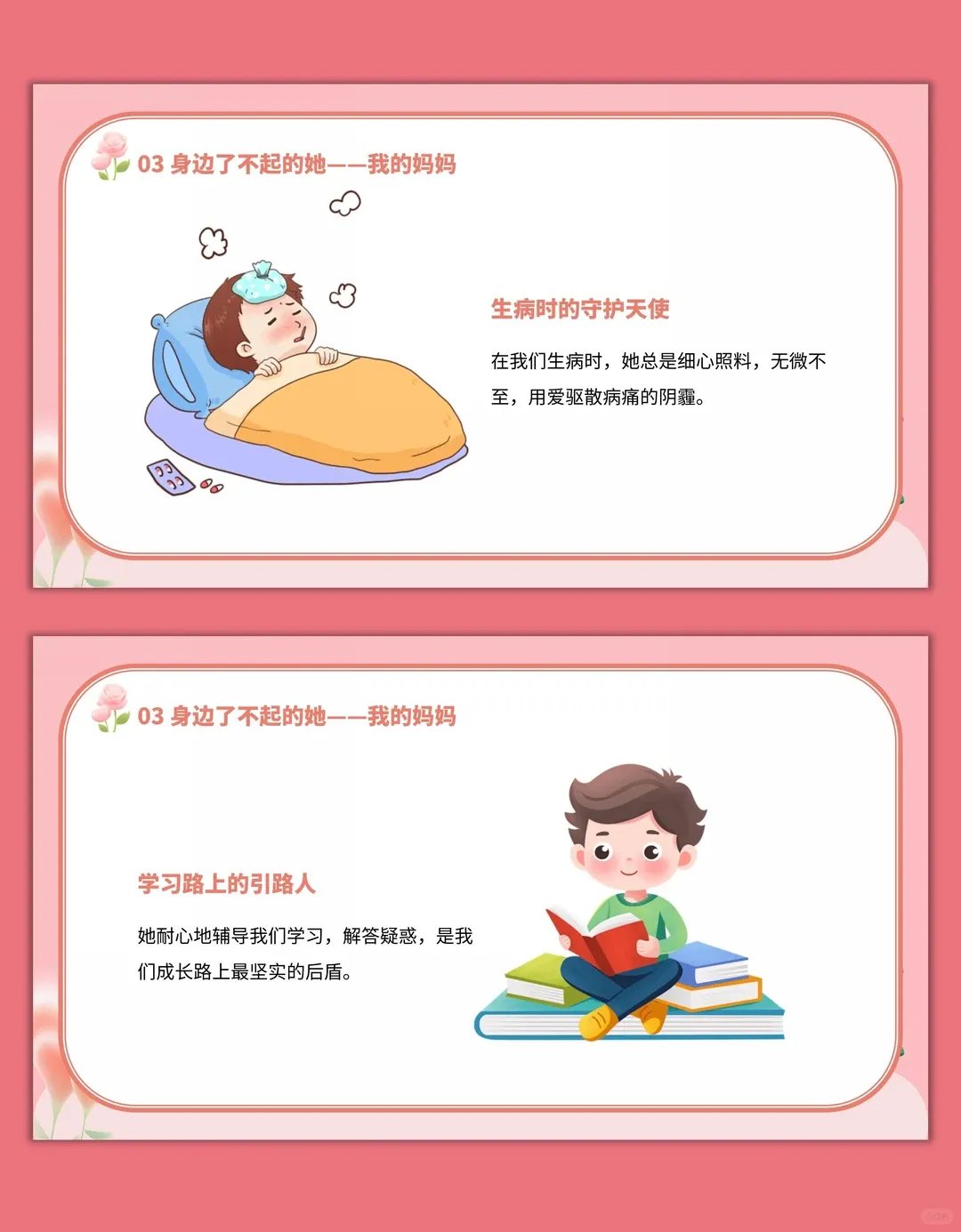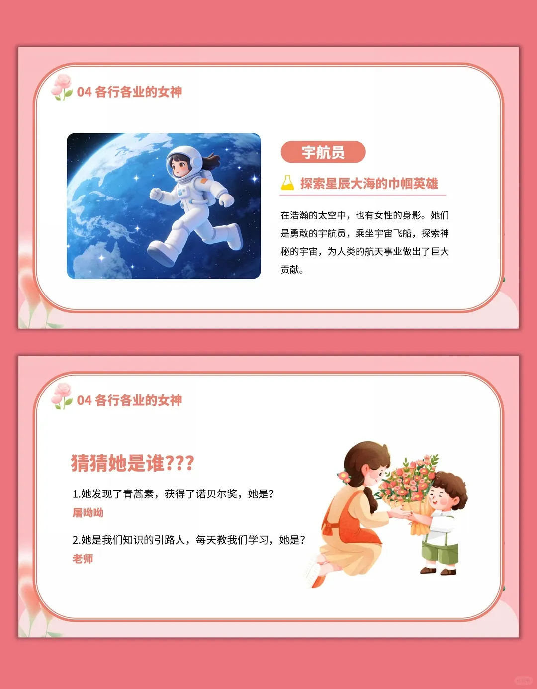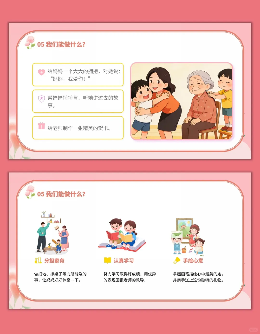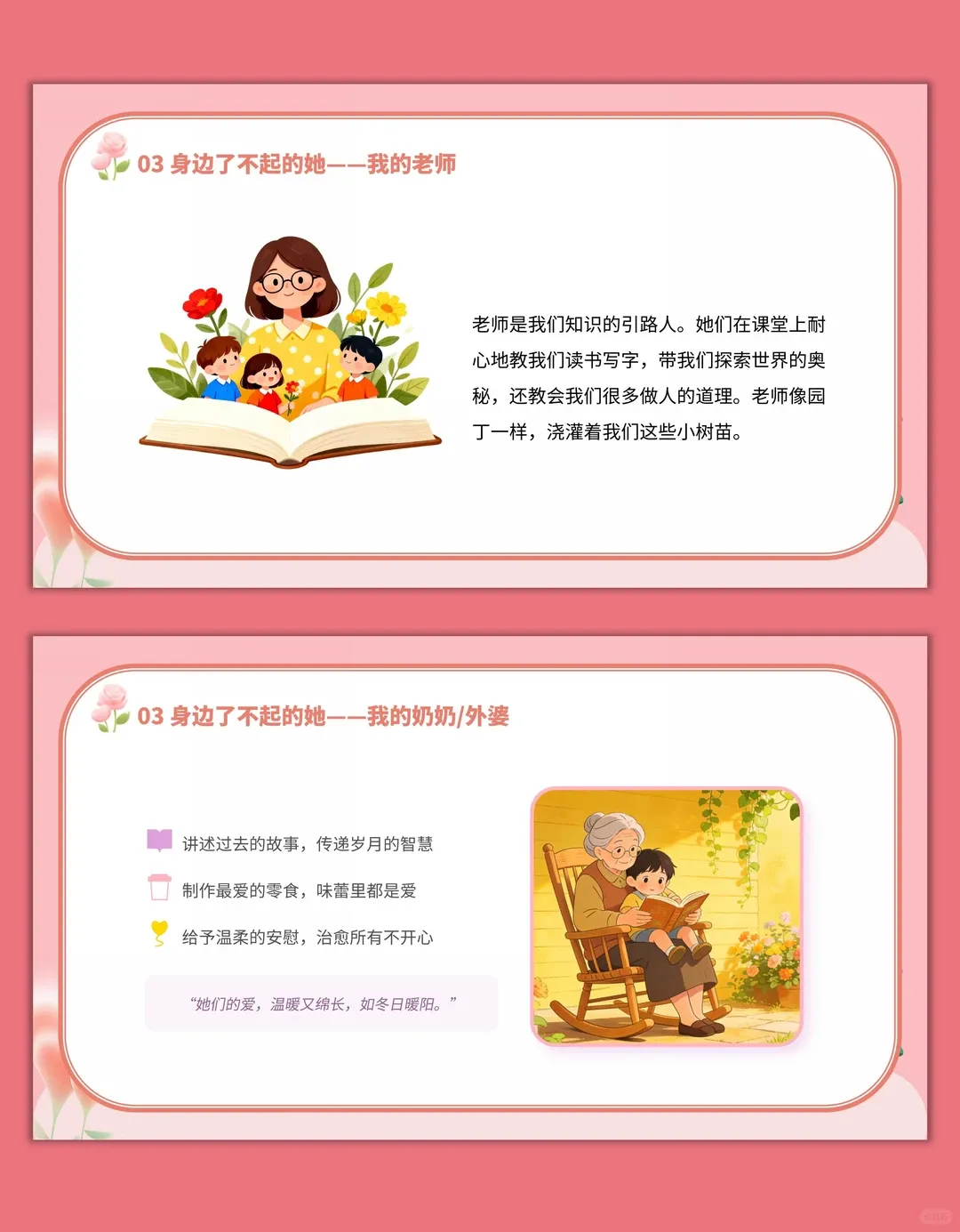 2.感受女性在生活、社会中的重要作用,培养对妈妈、老师、奶奶 / 外婆等身边女性的感恩之情,尊重每一位女性的付出。