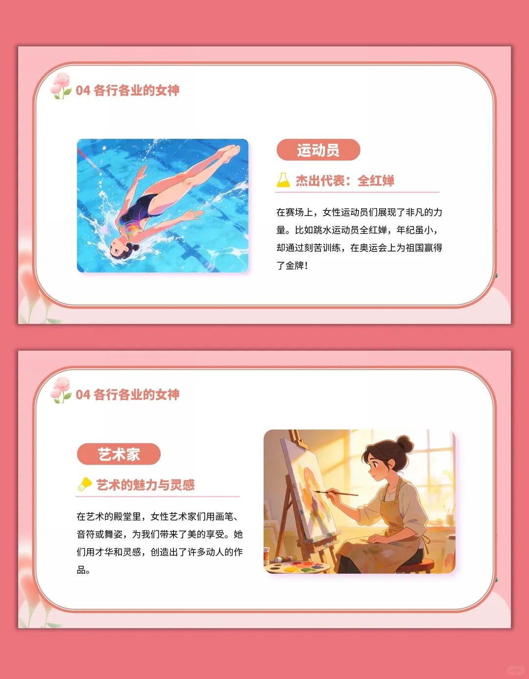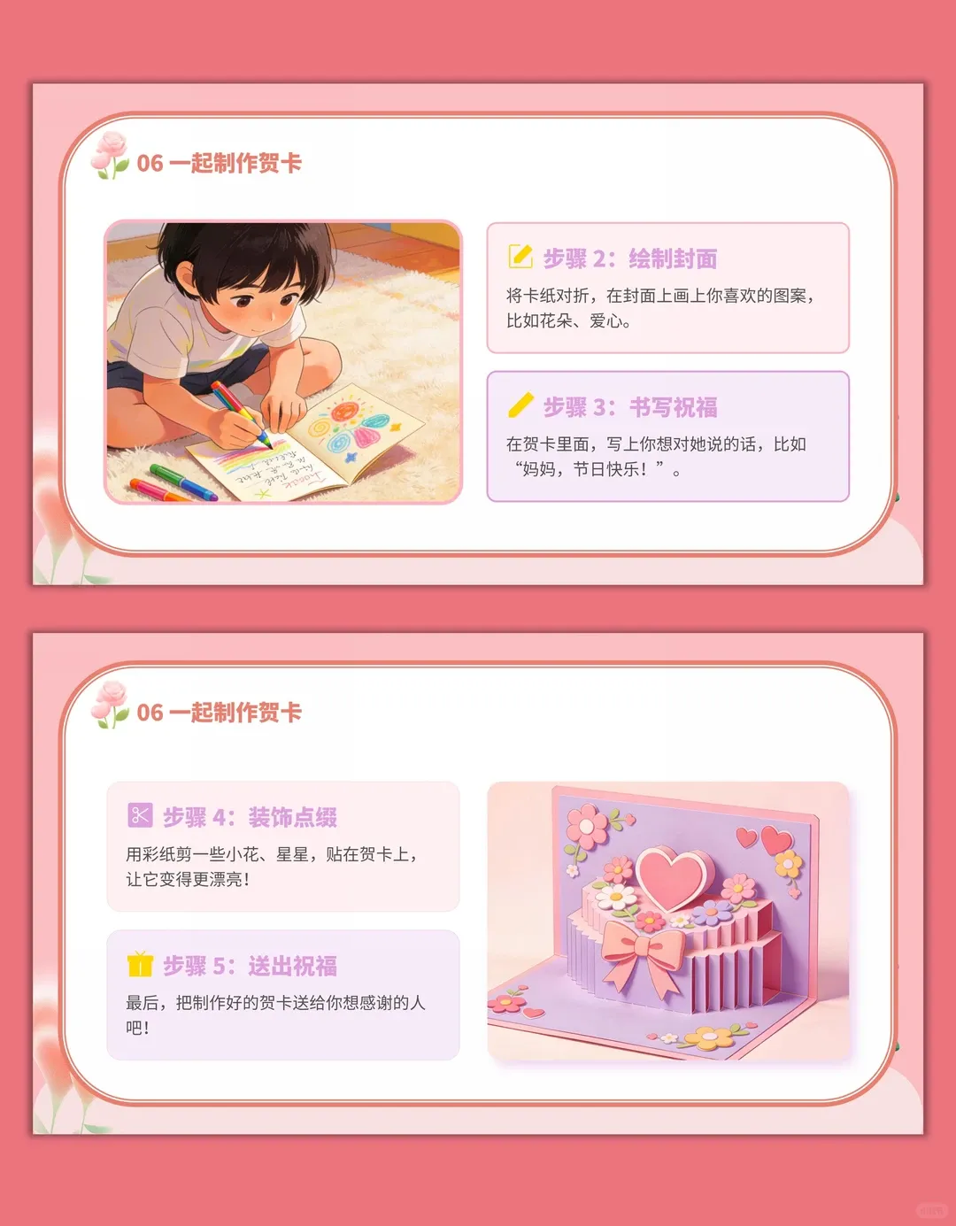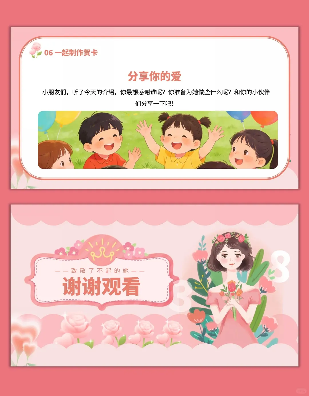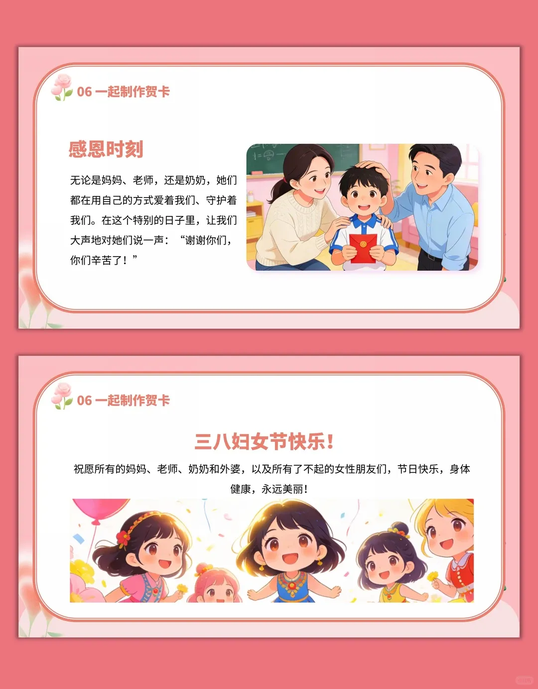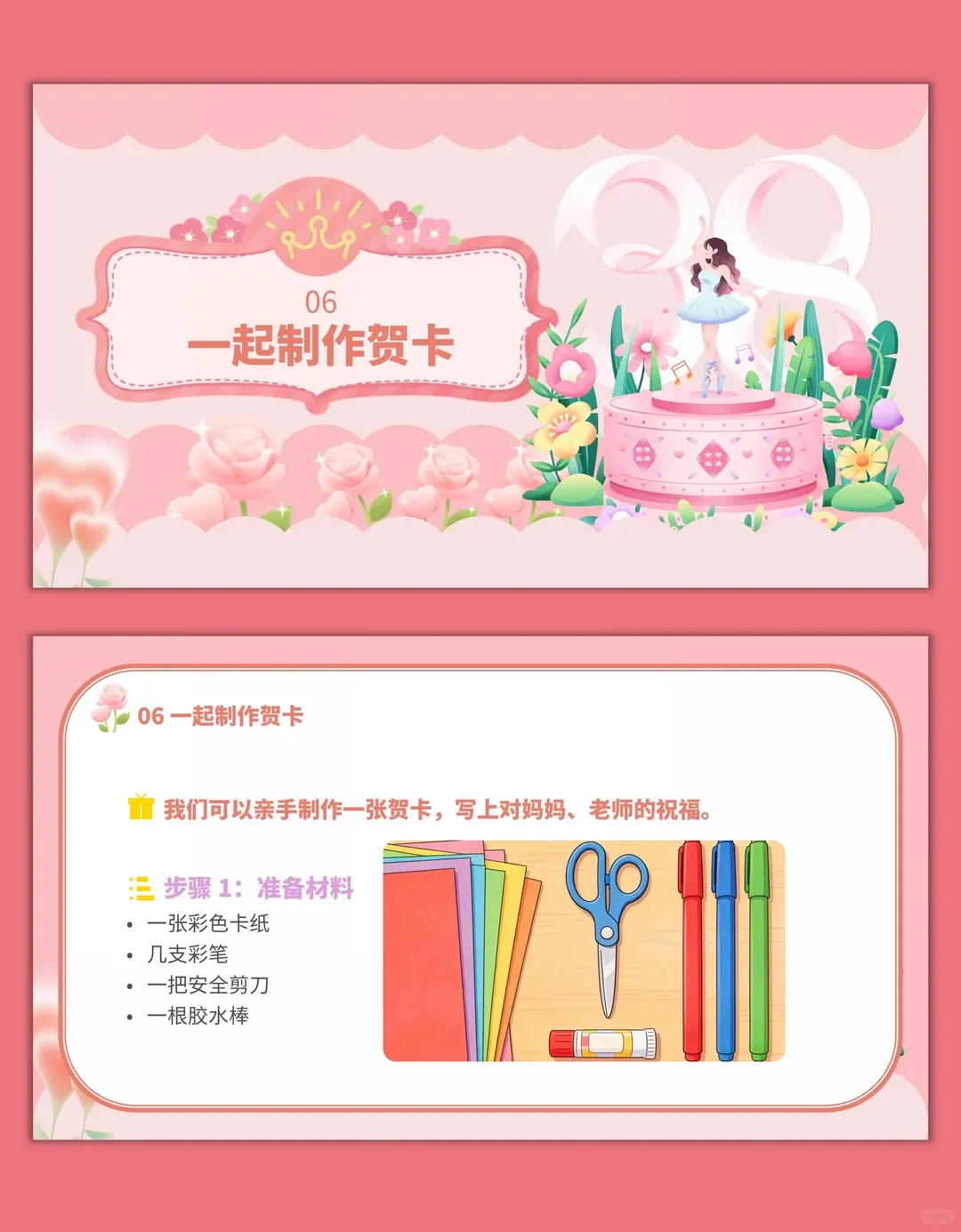 3.学会用简单的方式表达对女性的祝福,能亲手制作节日贺卡,掌握基础的贺卡制作步骤。