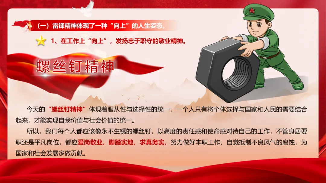PPT共51页,配套文稿8200字。包含五个部分:雷锋的一生(含珍贵日记);雷锋精神基本内涵;时代内涵;代代传承(榜样+“十五五”);以雷锋精神引领正确政绩观。聚焦“向上”“向善”,与政绩观结合。适合各级党组织、团委、学校、企事业单位使用。