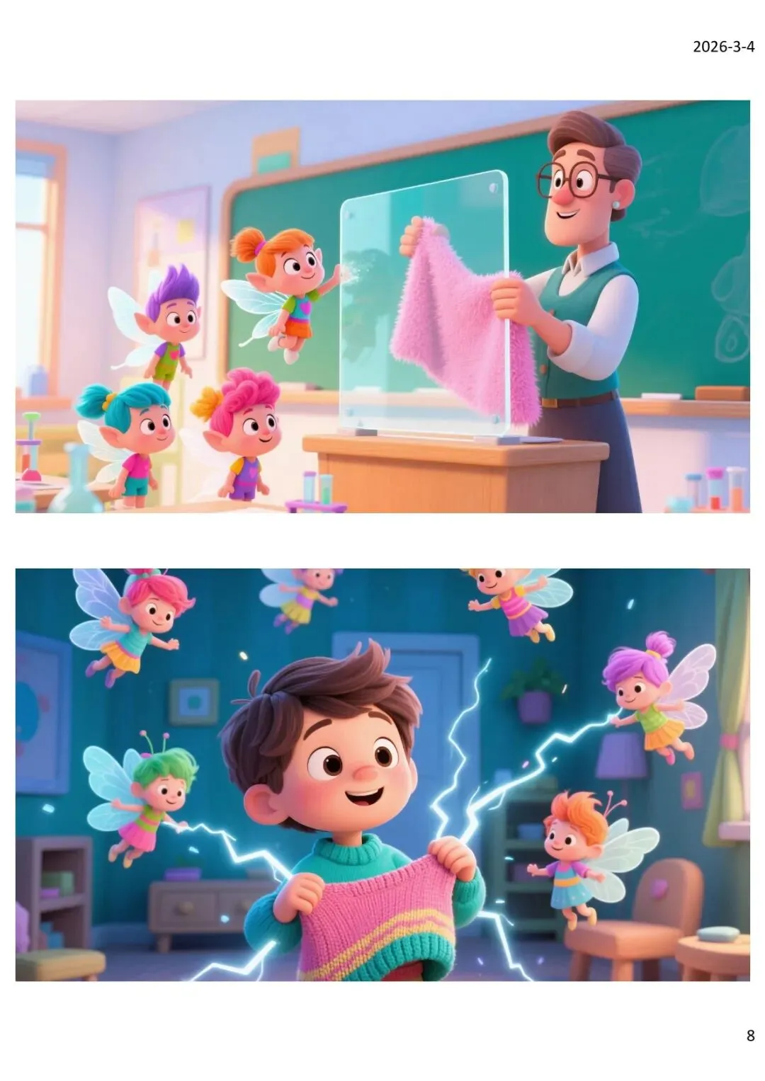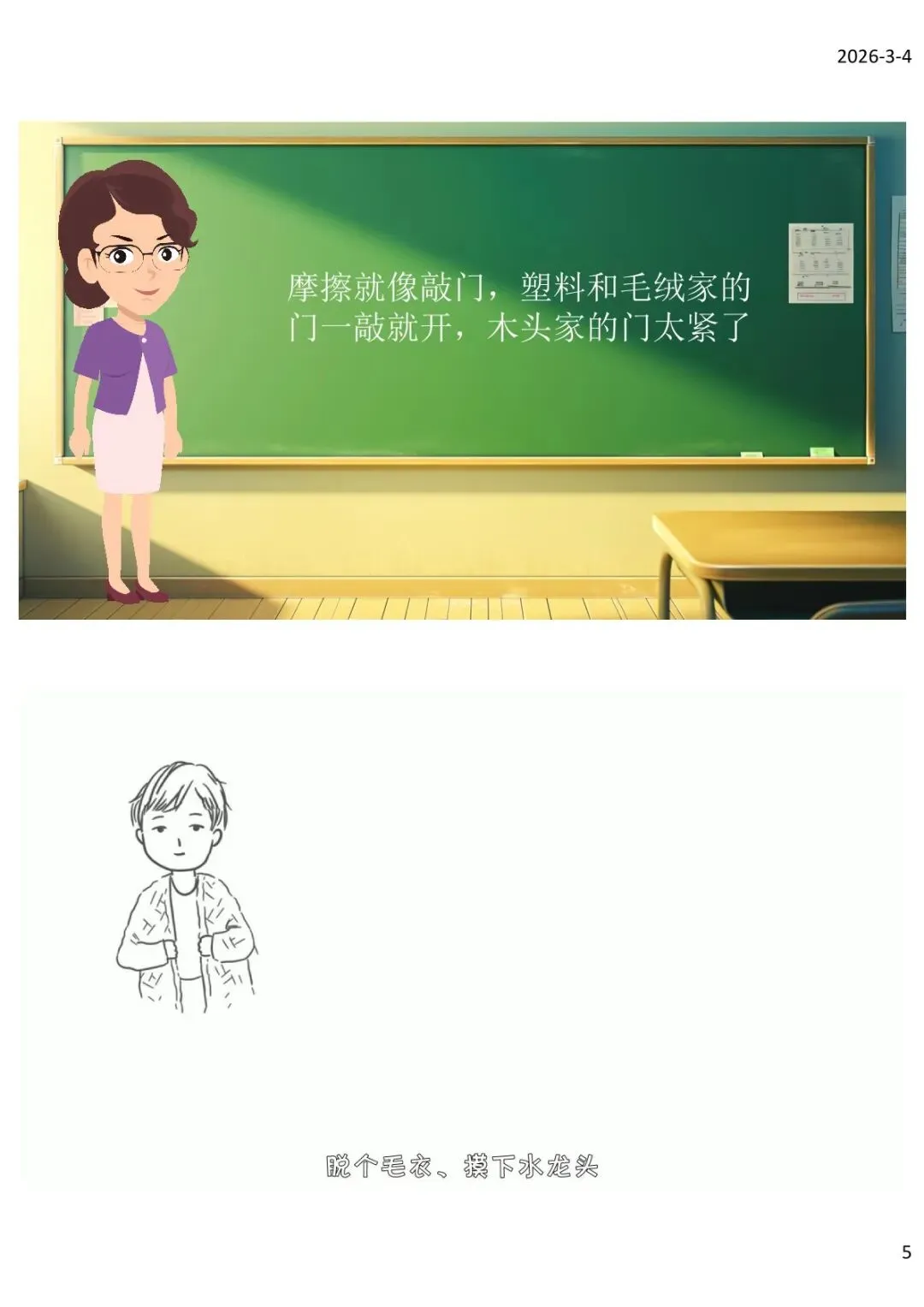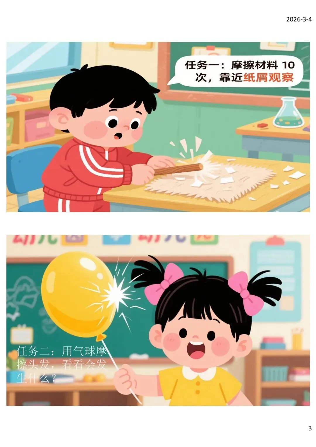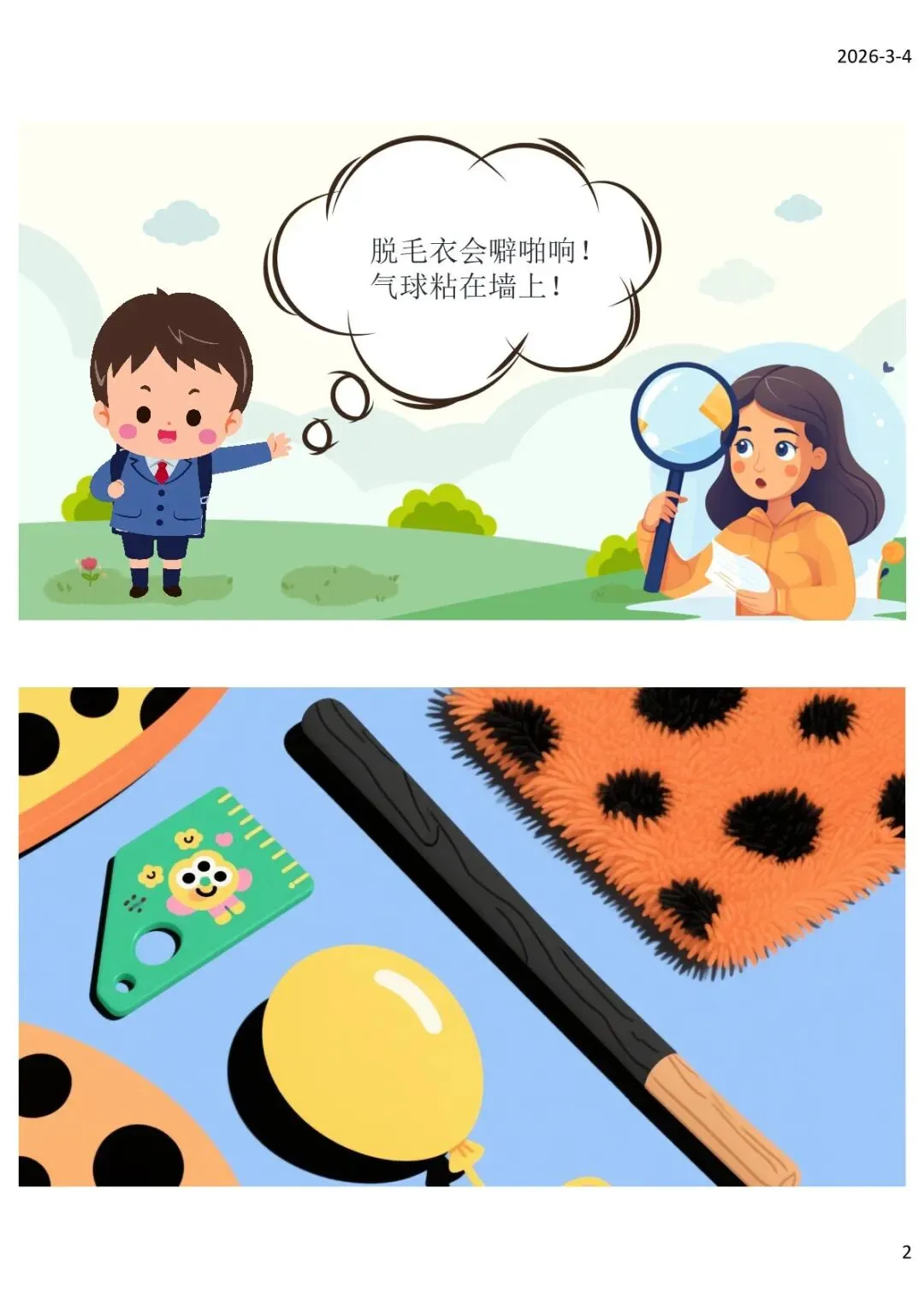 2.揭秘原理——静电精灵苏醒记。理解摩擦动作与静电产生的关系(摩擦是唤醒静电的必要条件)。感知材料差异对静电吸附效果的影响(塑料、毛绒易产生静电,木头不易)。