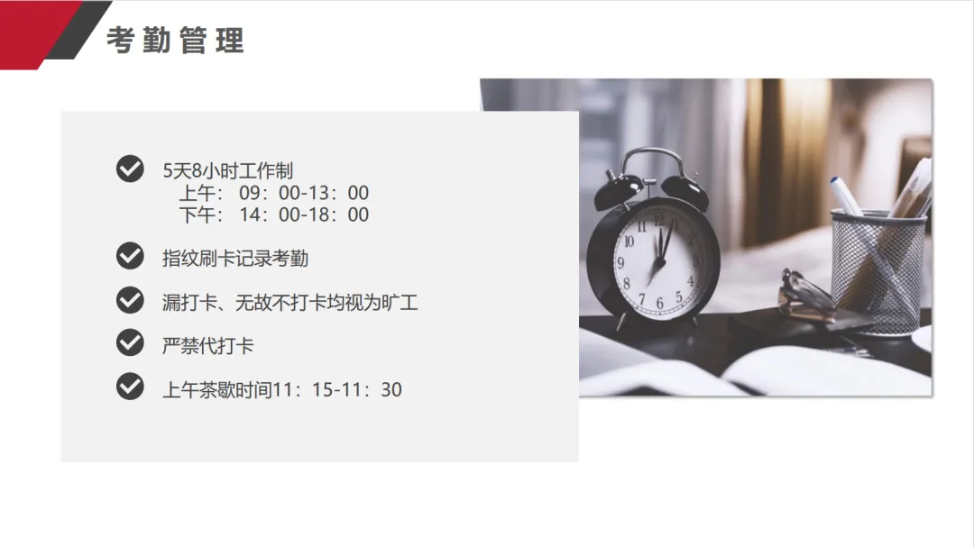 考勤制度是人事管理中最普遍的制度,是每一位职场人在任何一家企业都最先接触到的制度了,它确保了员工工作的有序进行和企业的正常运营,所以公司的考勤时间、方式、休假制度以及特殊情况说明都应该在入职培训阶段就与员工说明,以防止入职后因制度不明确而造成误会,进而影响工作进度。