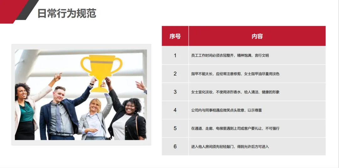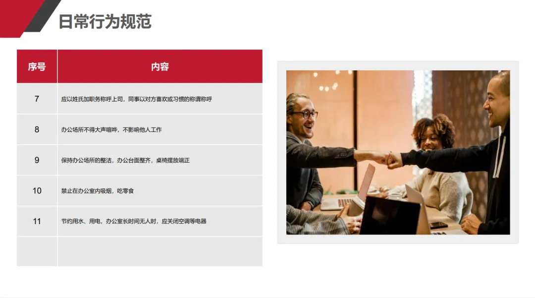 为了能够建立起一个稳定、高效和积极的工作环境,很多公司会制定一系列的日常行为规范,这部分内容也应该在培训阶段提前与员工明确。