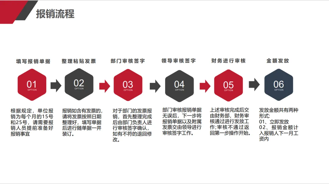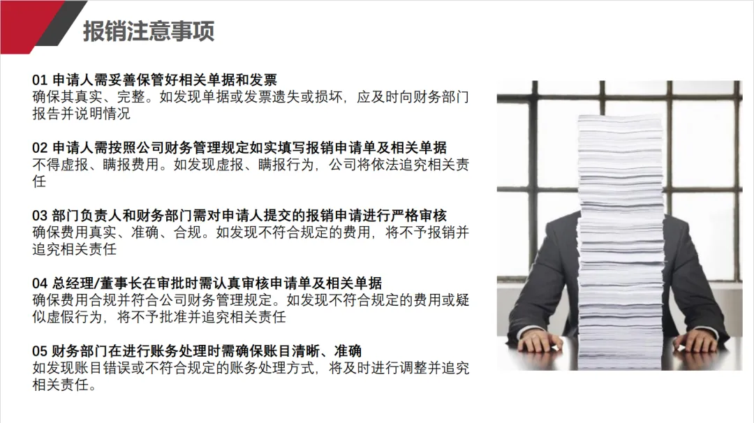 新员工入职后,除了需要了解公司概况、人事管理制度和行政管理制度外,财务管理制度也是重要的一环,而除了采购人员,其他岗位接触到较多的就是报销制度了,所以在入职培训中,可以将这一部分作为重点,向大家明确公司的报销流程、类别以及报销过程中的注意事项等。