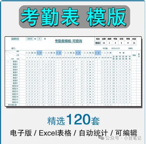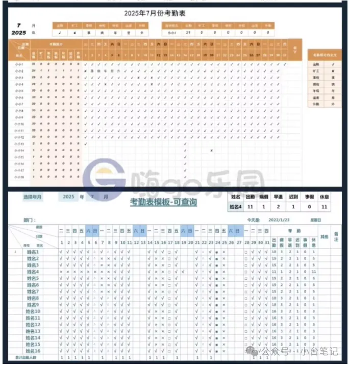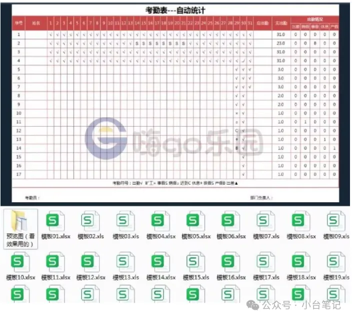 考勤表电子版模板excel公司员工工地工厂出勤记录带公式自动统计