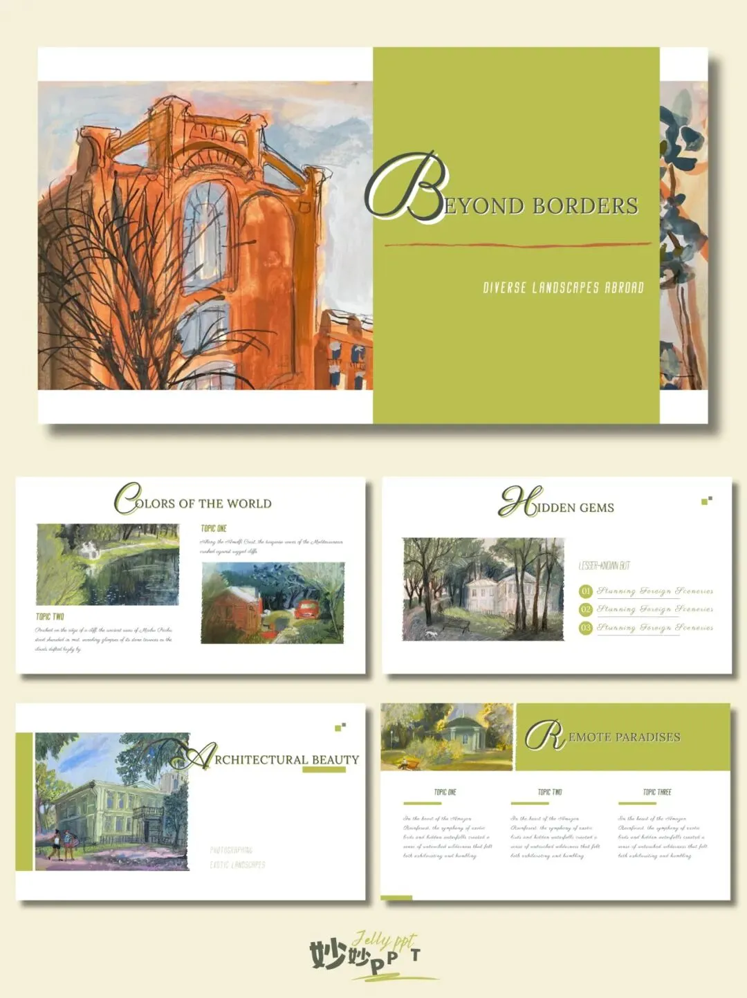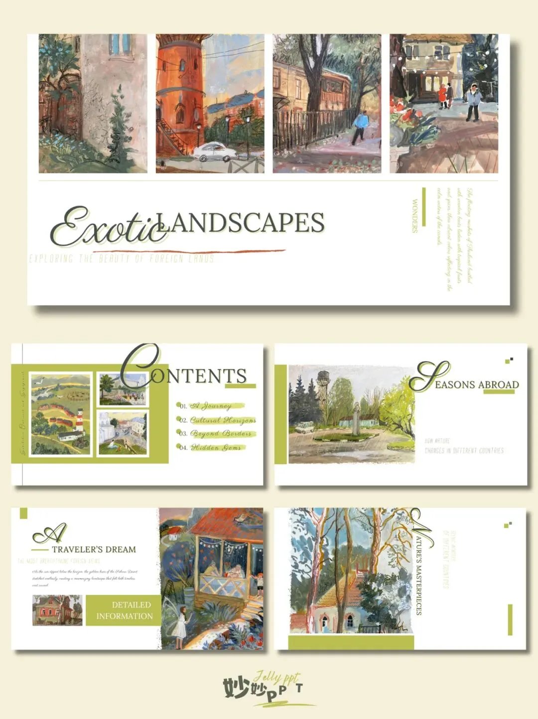 306|异国风景 绿色系ppt|插画风PPT|简约风PPT|ppt模板|ppt课件|素材