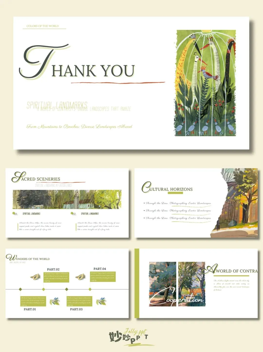 >306|异国风景 绿色系ppt|插画风PPT|简约风PPT|ppt模板|ppt课件|素材