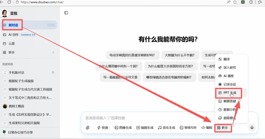 1、打开豆包官网:https://www.doubao.com,在豆包的主页打开新对话,在对话功能窗口,你点击“更多”中的PPT生成功能。