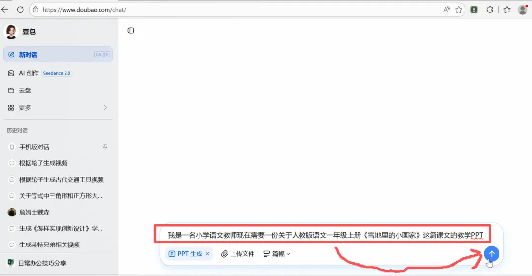 2、在对话框中输入我们想要生成的PPT主题,我们以一年级语文《雪地里的小画家》为主题。输入这样的提示语“我是一名小学语文教师现在需要制作一份关于人教版语文一年级上册《雪地里的小画家》这篇课文的教学PPT”,点击发送即可。