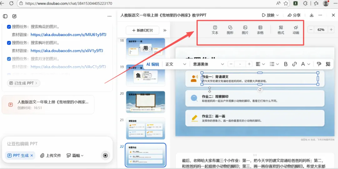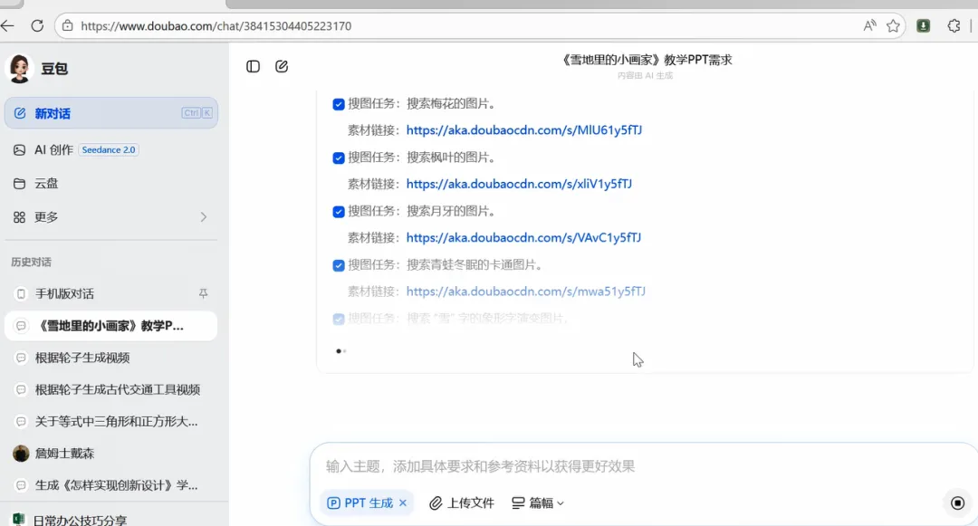 3、点击发送,豆包就开始自动制作教学演示文稿、从网络精准搜索课件中需要的图片素材。