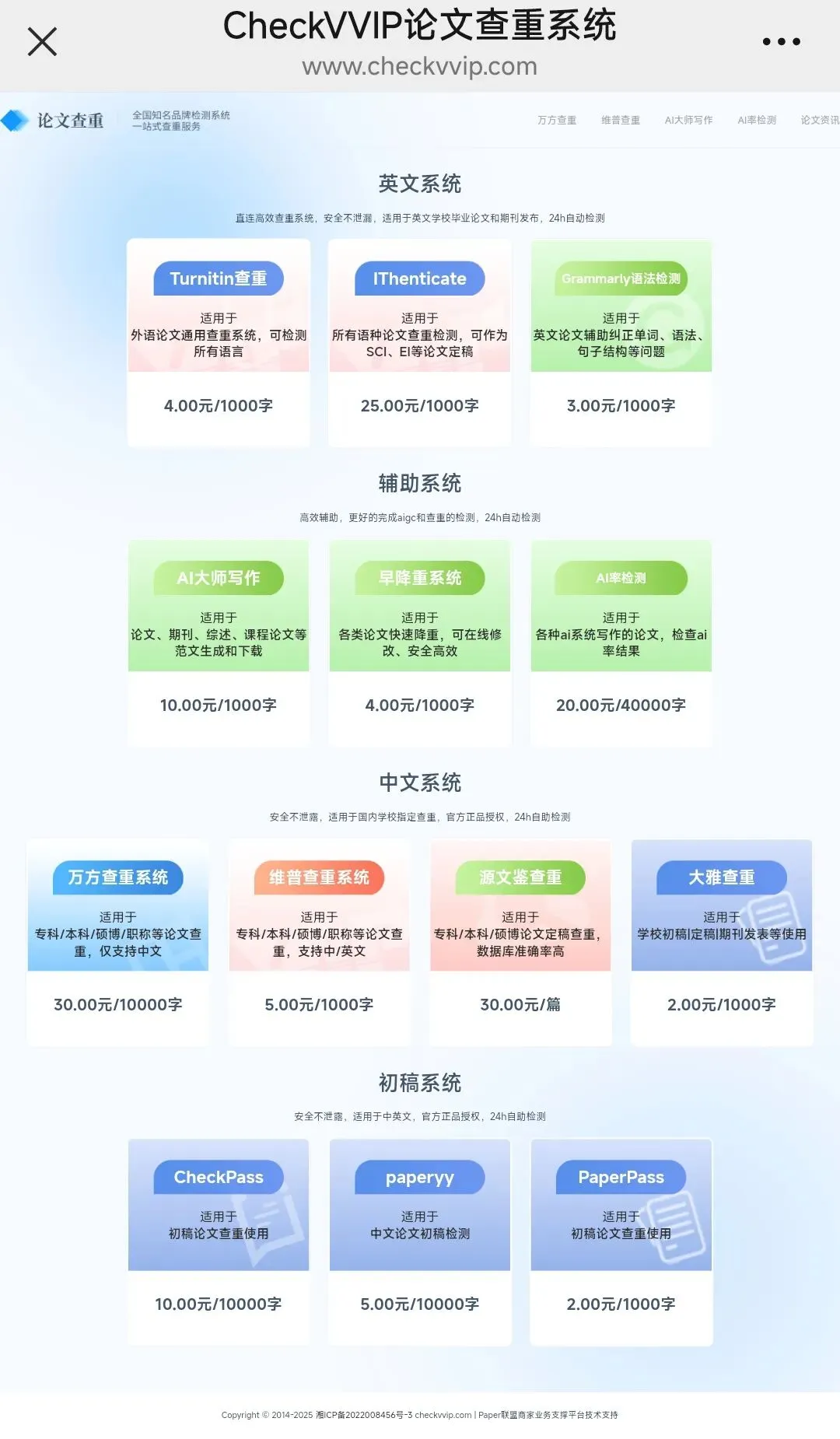 (checkvvip论文查重系统有Turnitin、iThenticate、万方、源文鉴、早降重(降AI、重复率)、AI大师写作、AI检测等十多个系统,官方授权,权威检测!)