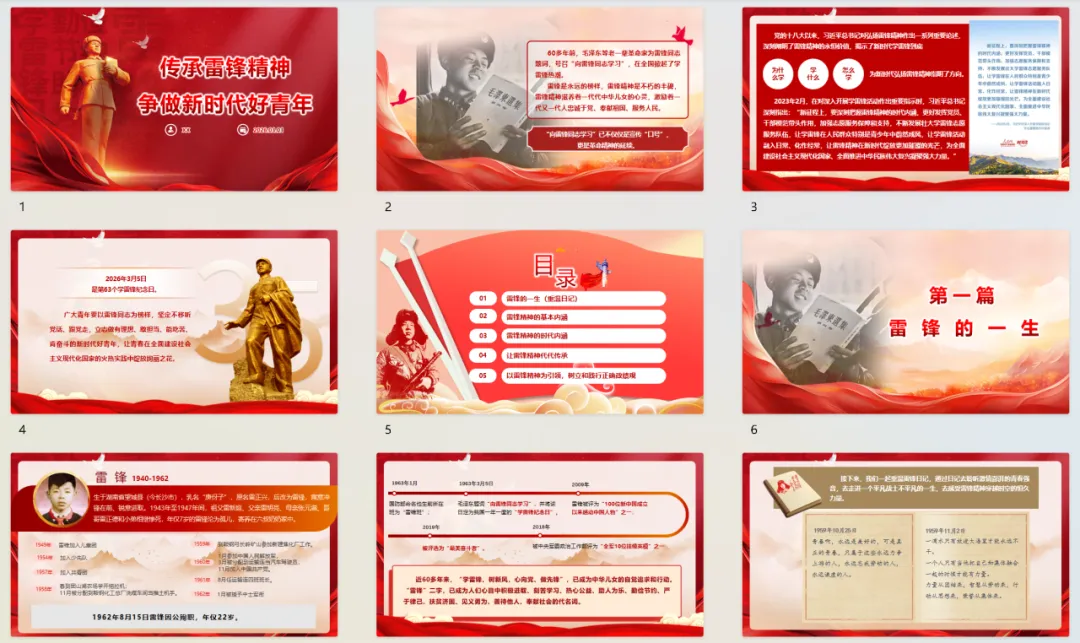 最新整理的学雷锋纪念日专题PPT《传承雷锋精神 争做新时代好青年》,紧扣2026年3月5日第63个学雷锋纪念日,系统展现雷锋生平与日记原稿,深度解析雷锋精神基本内涵与时代价值。PPT图文并茂,页面精美大气,层次清晰,逻辑严谨,内容精准可靠。