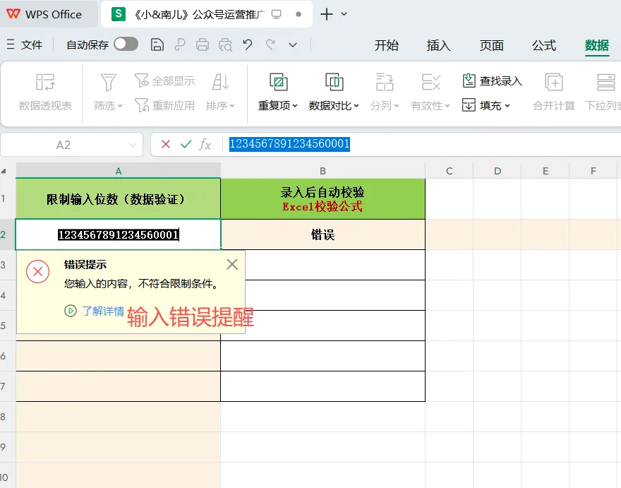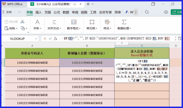 =IF(B2="","",IF(MID("10X98765432",MOD(SUMPRODUCT(MID(B2,ROW($1:$17),1)*{7;9;10;5;8;4;2;1;6;3;7;9;10;5;8;4;2}),11)+1,1)=RIGHT(B2),"正确","错误"))