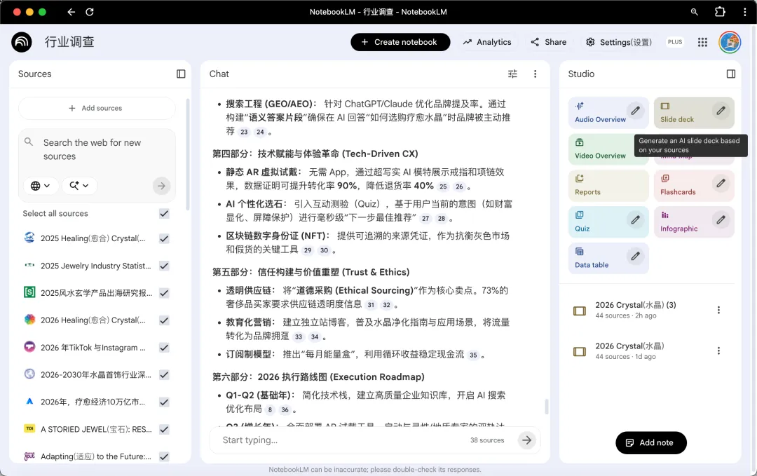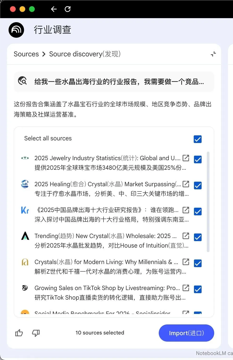 这次我直接在NotebookLM的搜索框搜关键词,把相关材料一键导入,行业报告、白皮书、竞品页面全都扔进同一个Notebook里。