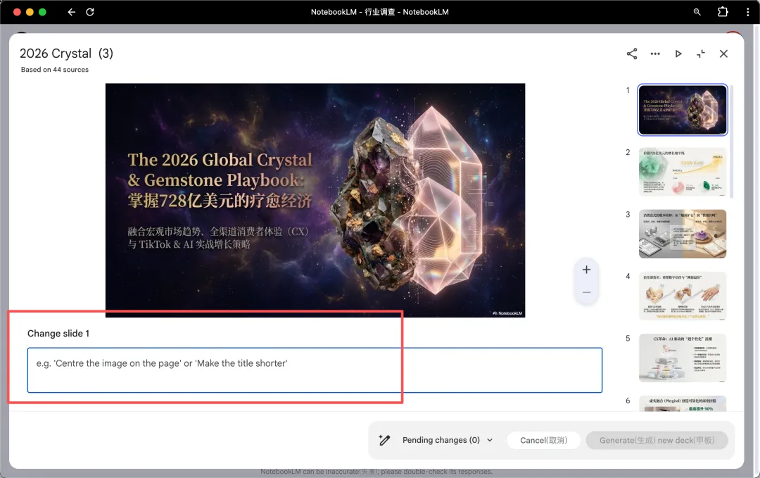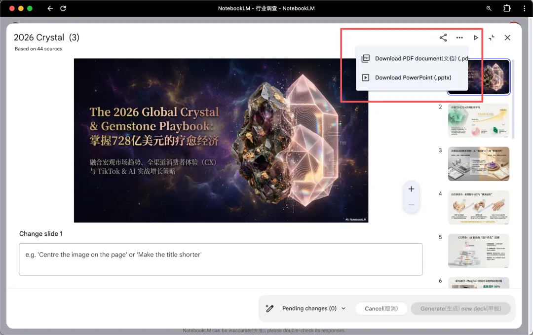 然后在对话框里跟它说清楚想突出的重点,点击「Slide Deck」,PPT就生成好了。