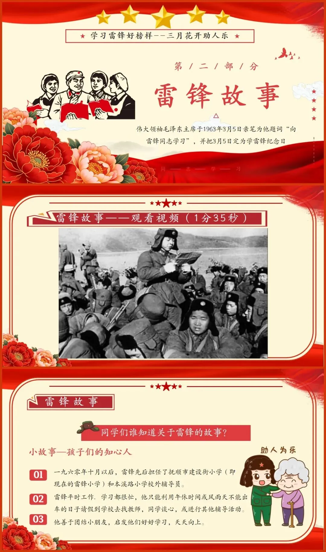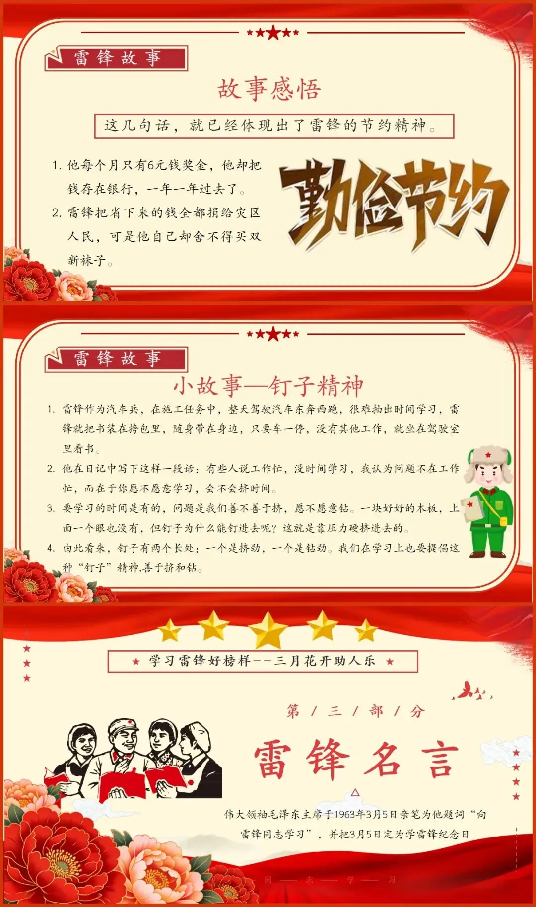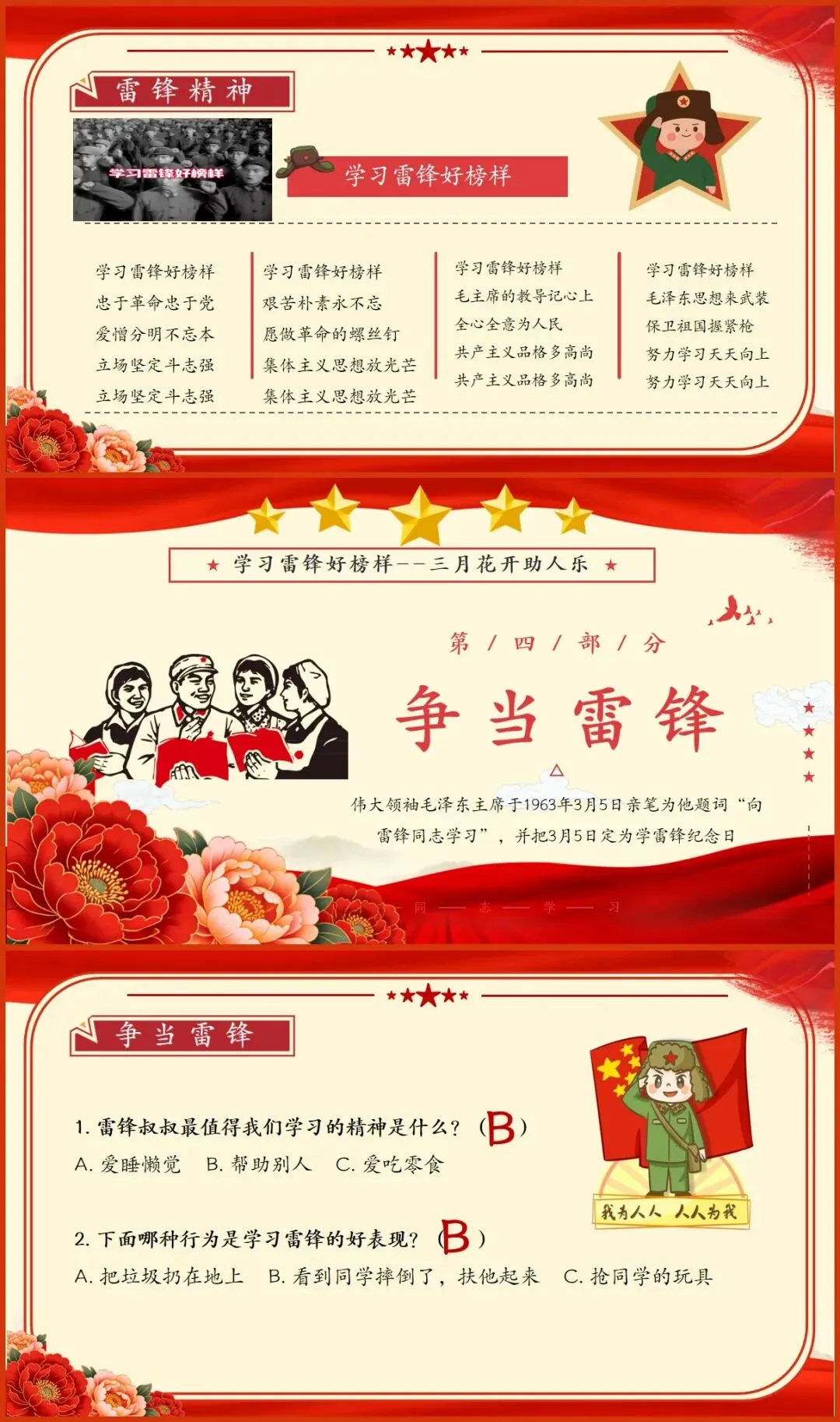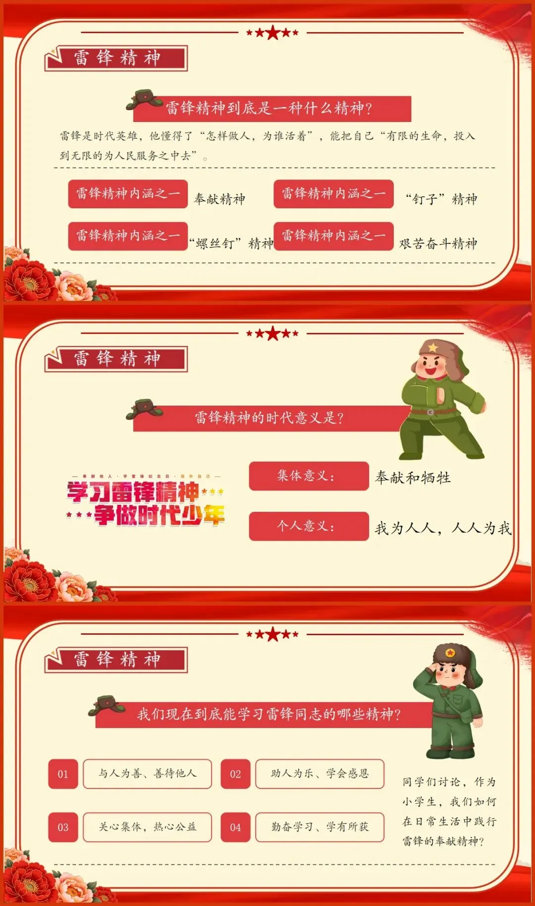 谁还在为学雷锋班会熬夜做PPT?这套成品直接抄作业!✅从雷锋生平、经典故事到“钉子精神”解读,逻辑超清晰。最绝的是配套了12道随堂互动题,低年级娃也能秒懂。课堂上放了短片,再带娃做“班级小雷锋”宣誓,氛围感拉满。不仅教会孩子助人为乐,更把奉献精神落到了日常小事里。