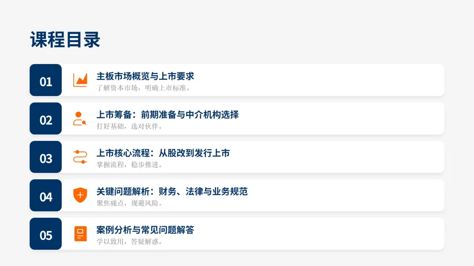 最新《主板辅导培训课件》,全套共20页,系统涵盖主板市场概览、上市筹备、核心流程解析、关键问题应对及实务案例分析等核心模块,旨在为企业及业内人士提供全面、专业的上市辅导与实务参考。