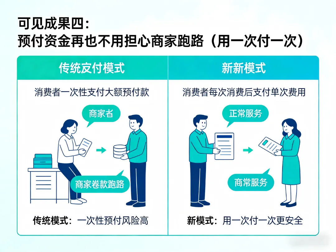 预付资金管理 | 用一次付一次,跑路自动退钱 | 覆盖数万商家,消费者资金零风险 |