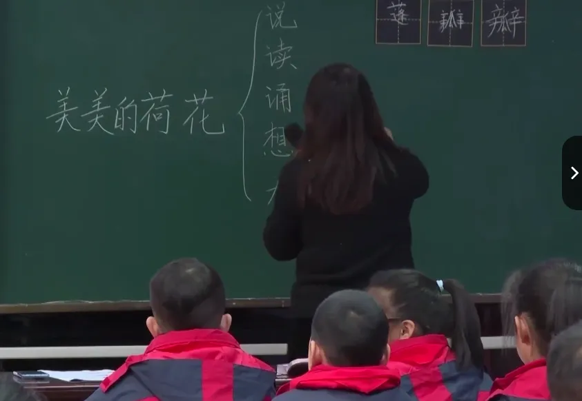 师:好,继续,这个呢?又一个生僻字,不认得了啊。其实荷花呢,在画家的笔下各有各的美,那也真的是一朵有一朵的姿势,看看这一朵,看看那一朵。