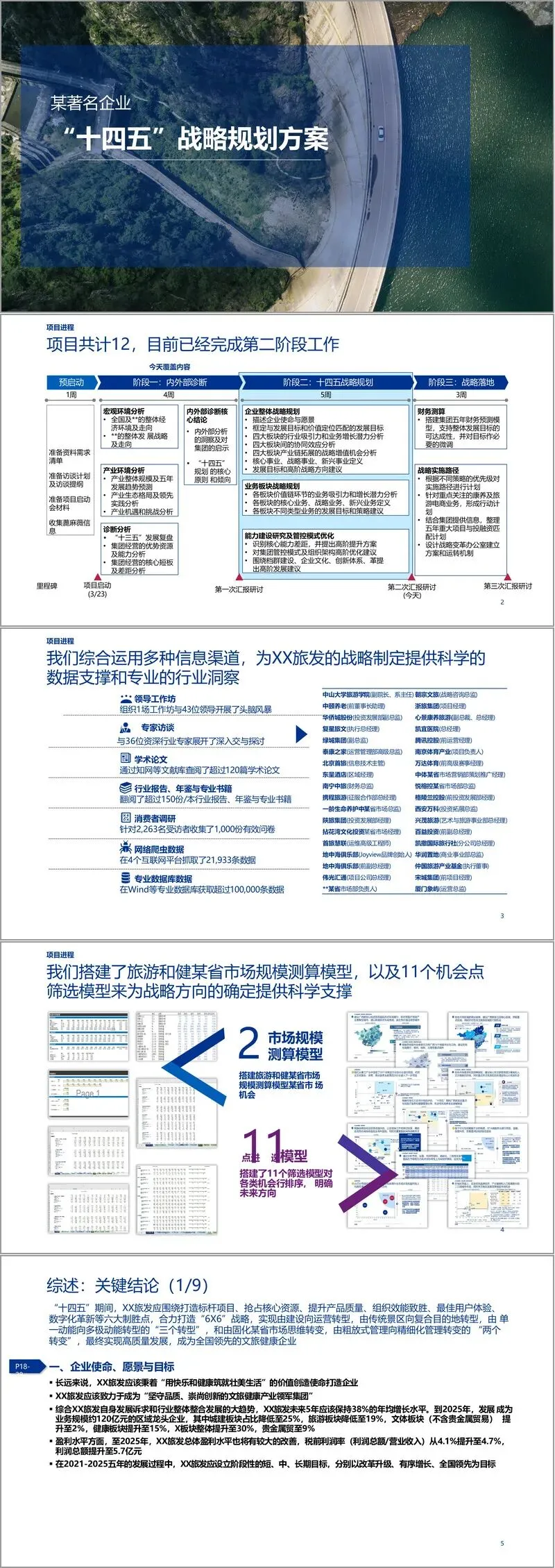 方案开篇通过宏观环境、产业环境与集团自身诊断的三重分析,明确了发展根基。团队访谈 36位行业专家,整合 150 余份行业报告、120 余篇学术论文及海量调研数据,精准复盘 “十三五” 发展成果,梳理出集团在资源储备、业务布局上的优势,以及在专业化运营、数字化建设等方面的短板。基于此,方案确立了 “用快乐和健康筑就壮美生活” 的企业使命,提出到 2025 年实现 120 亿元业务规模、38% 年均增长的目标,推动集团从传统景区运营向复合目的地服务商转型。