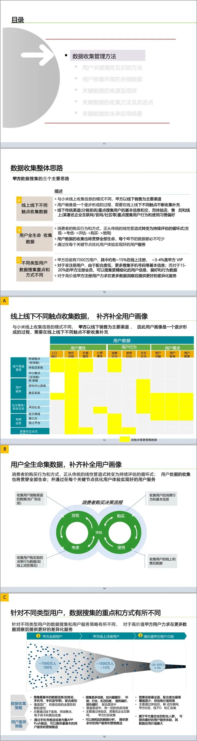 落地执行部分设计了针对性的数据收集策略。结合集团线下销售为主的渠道特性,采用 “线上线下多触点互补收集” 模式:有导购渠道通过导购问询与电子保卡注册双轨采集,无导购渠道通过开机注册引导用户自主填报;线上触点强化手机号注册验证,通过营销活动补全老用户信息;客服与售后触点则打通现有数据,补充用户缺失属性及服务相关数据。针对不同用户群体实施差异化收集策略,高价值用户重点收集精细化信息,普通用户聚焦核心识别字段,确保数据收集的效率与质量。