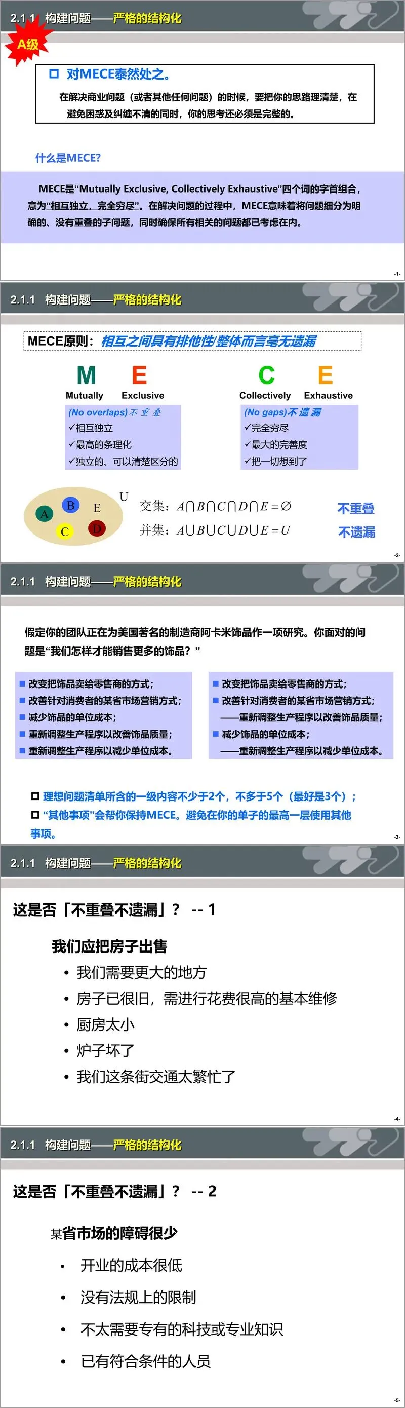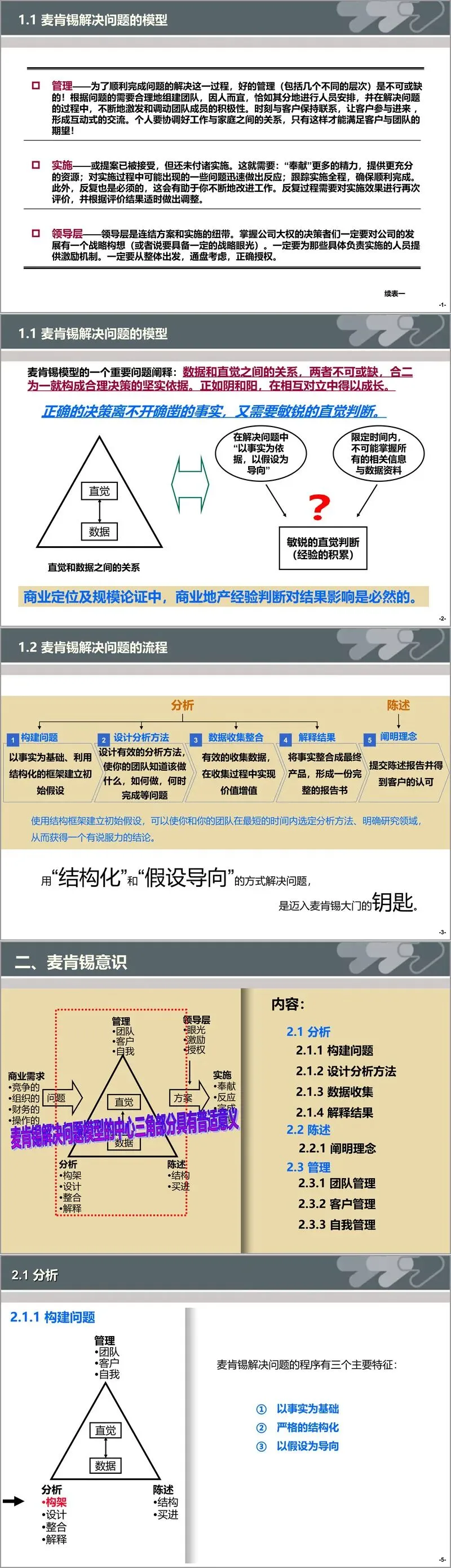 文件开篇构建了麦肯锡解决问题的核心模型与流程。模型以 “商业需求” 为起点,串联 “分析、陈述、管理、实施、领导层” 五大关键环节,强调数据与直觉的辩证统一 —— 数据为决策奠定坚实基础,直觉则在有限信息下提供方向指引,二者结合形成合理决策的核心依据。解决问题的流程遵循 “构建问题 - 设计分析方法 - 数据收集整合 - 解释结果 - 陈述报告” 五步闭环,核心要义是 “以事实为基础、以假设为导向、以结构化为框架”,确保解决问题的效率与效果。
