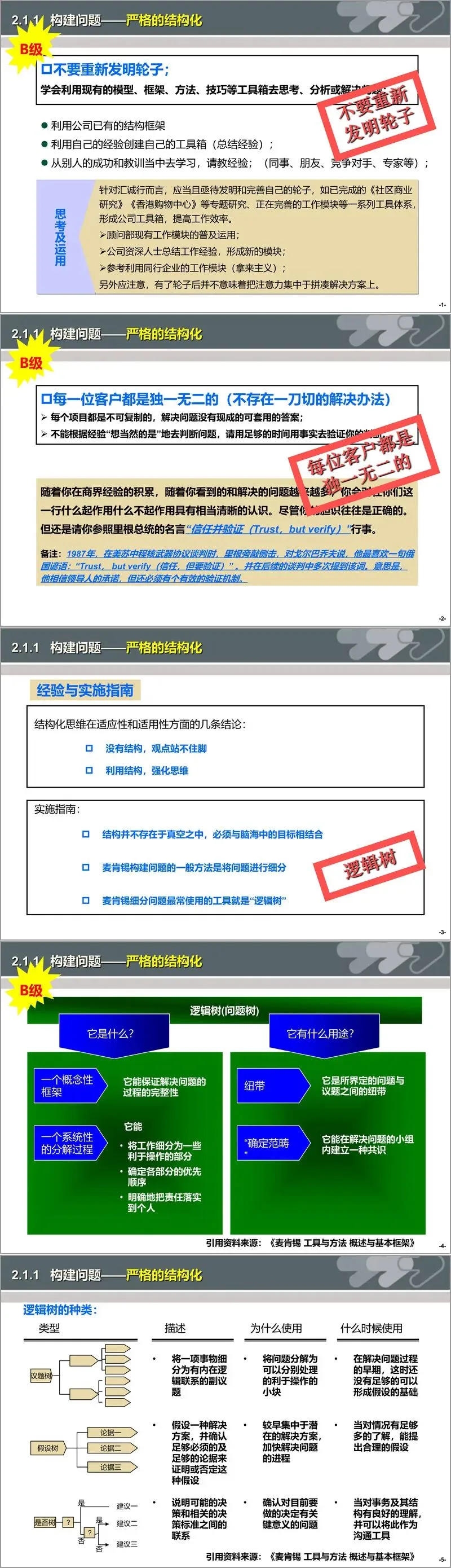 陈述环节聚焦 “如何让客户接受解决方案”,核心要求是结构清晰、简单明了。陈述报告需遵循 “从结论开始” 的归纳推理逻辑,先亮明核心观点,再用数据支撑,确保听众快速把握核心;每个图表仅承载一个信息,标题直接点明核心结论,避免复杂冗余;同时需通过 “电梯测验” 检验陈述效果,确保能在30 秒内清晰传达核心方案。“买进” 阶段则强调与客户的互动,通过预先沟通、量体裁衣等方式,减少信息不对称,建立信任,确保方案被客户认可与接受。