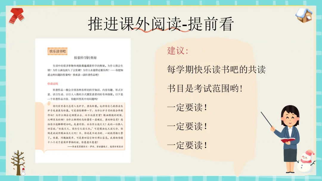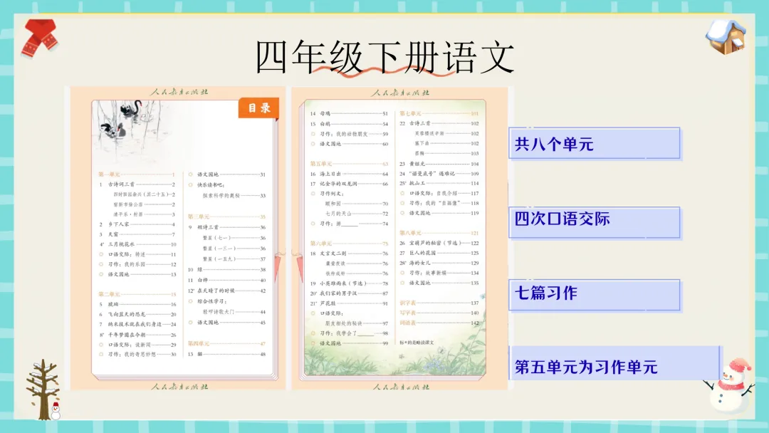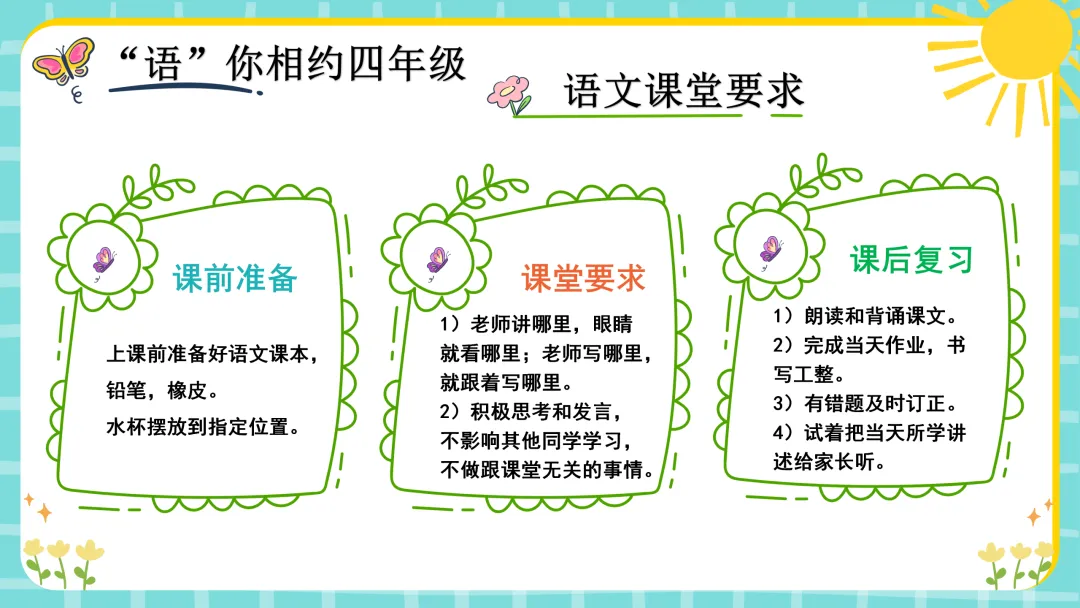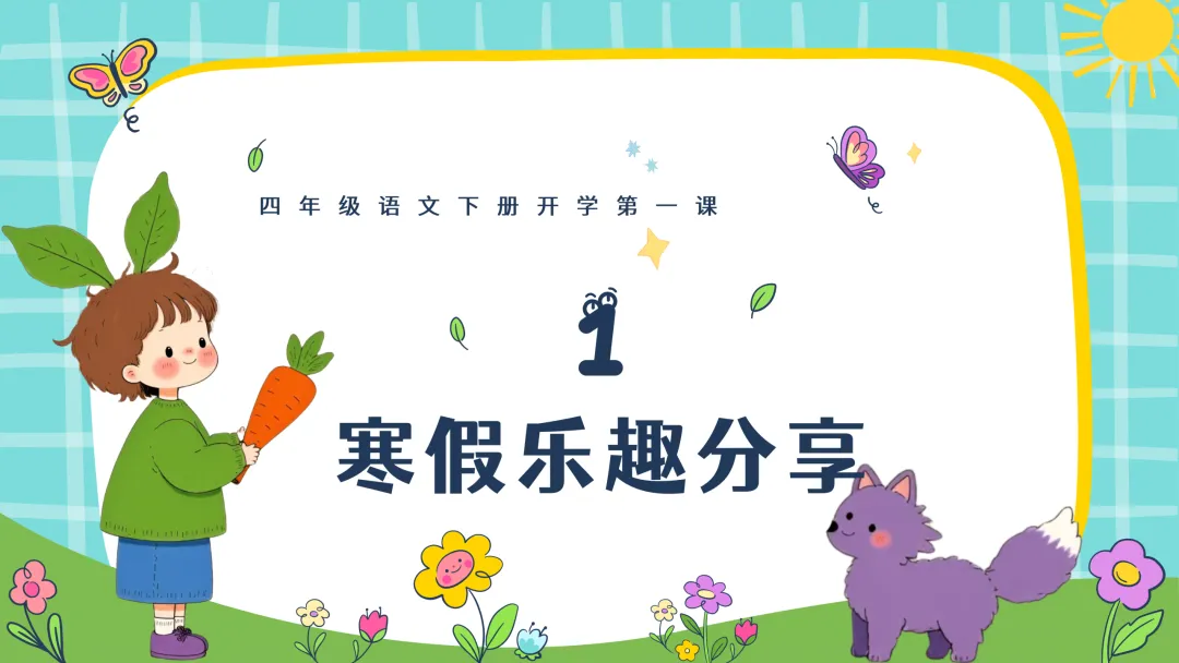 今天这节课分为五个部分:寒假乐趣分享、重温常规好习惯、“语”你相约四年级下册、如何学好语文、新学期启程指南。