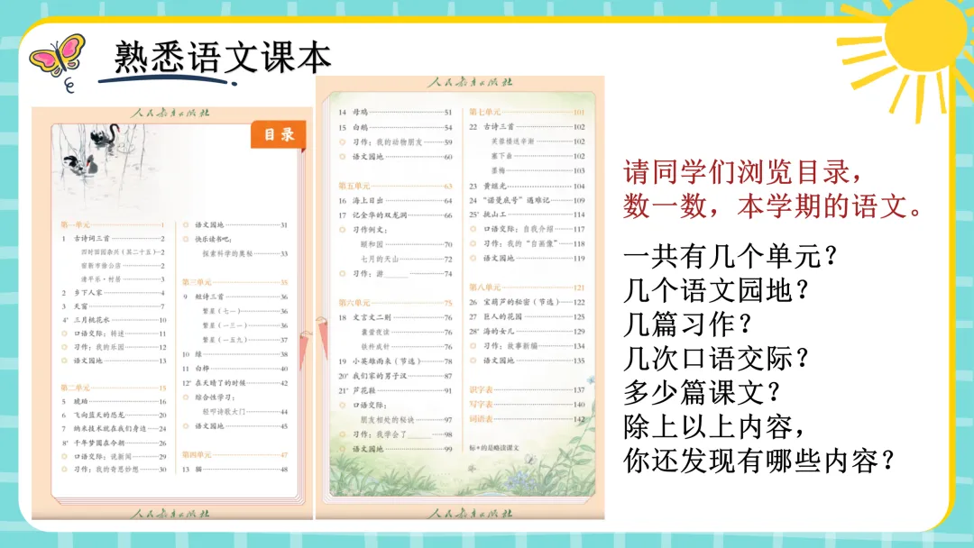 2、认识目录:请同学们浏览目录,数一数,本学期的语文。一共有几个单元?几个语文园地?几篇习作?几次口语交际?多少篇课文?