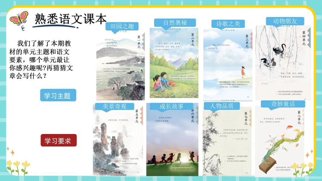 3、认识导读页:请同学们根据单元导语,概括出这单元的人文主题。(根据单元也讲解阅读要素和习作要素)PPT23页结合图片讲解每单元主题然后引导学生解了本期教材的单元主题和语文要素,分享哪个单元最感兴趣呢?再猜猜文章会写什么?