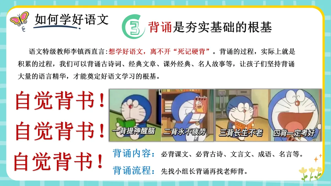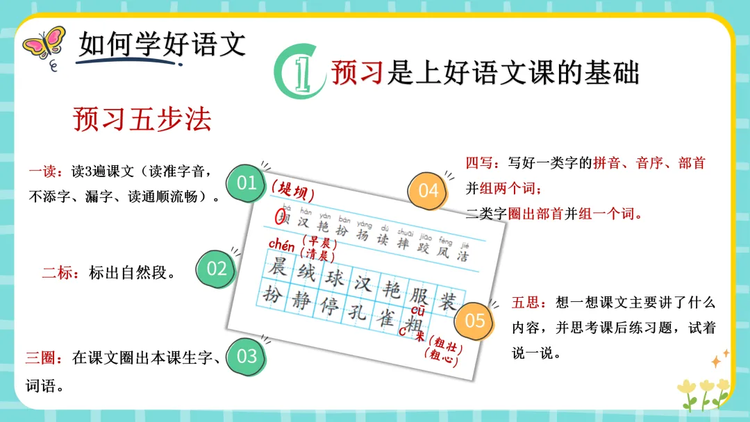 1.预习——一上好语文科的基础2.背诵——夯实基础的根基