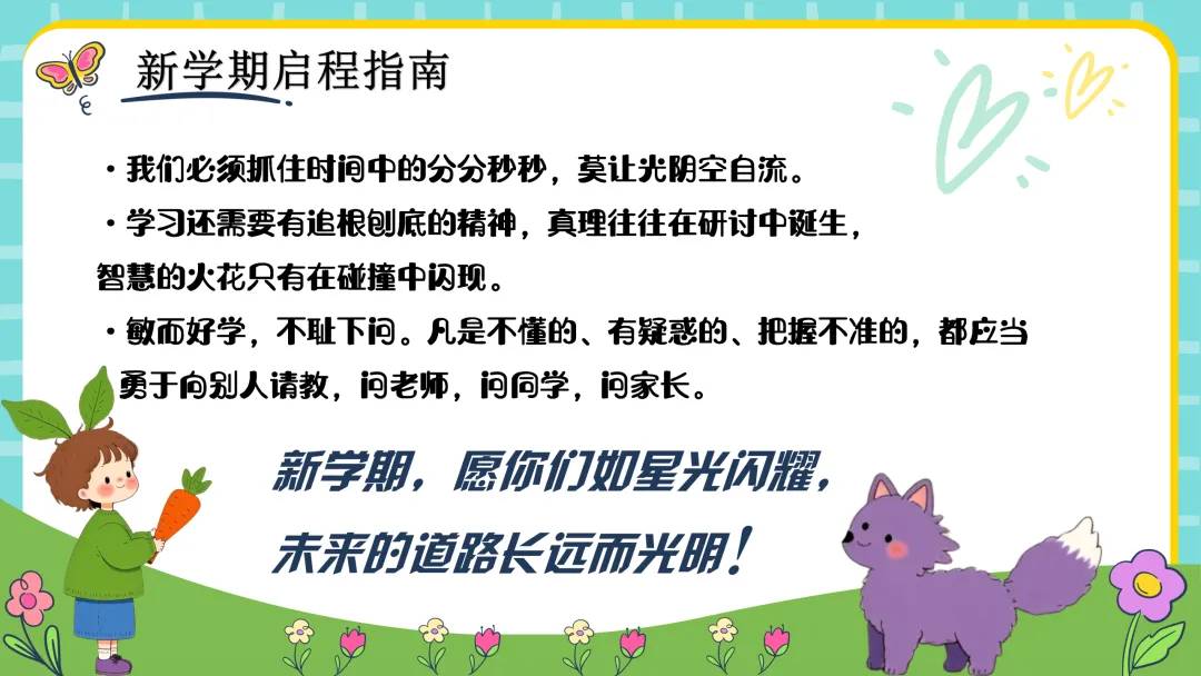 亲爱的同学们,新学期,新起点,新气象,愿同学们能信心百倍地投入到我们四年级的学习、生活中,老师将陪伴在你的左右航者,让我们去迎接挑战,成为你学习、生活的领袖、去创造辉煌!加油!!