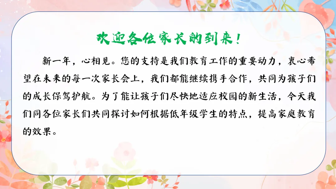 欢迎各位家长的到来!新一年,心相见。您的支持是我们教育工作的重要动力,衷心希望在未来的每一次家长会上,我们都能继续携手合作,共同为孩子们的成长保驾护航。为了能让孩子们尽快地适应校园的新生活,今天我们同各位家长们共同探讨如何根据低年级学生的特点,提高家庭教育的效果。