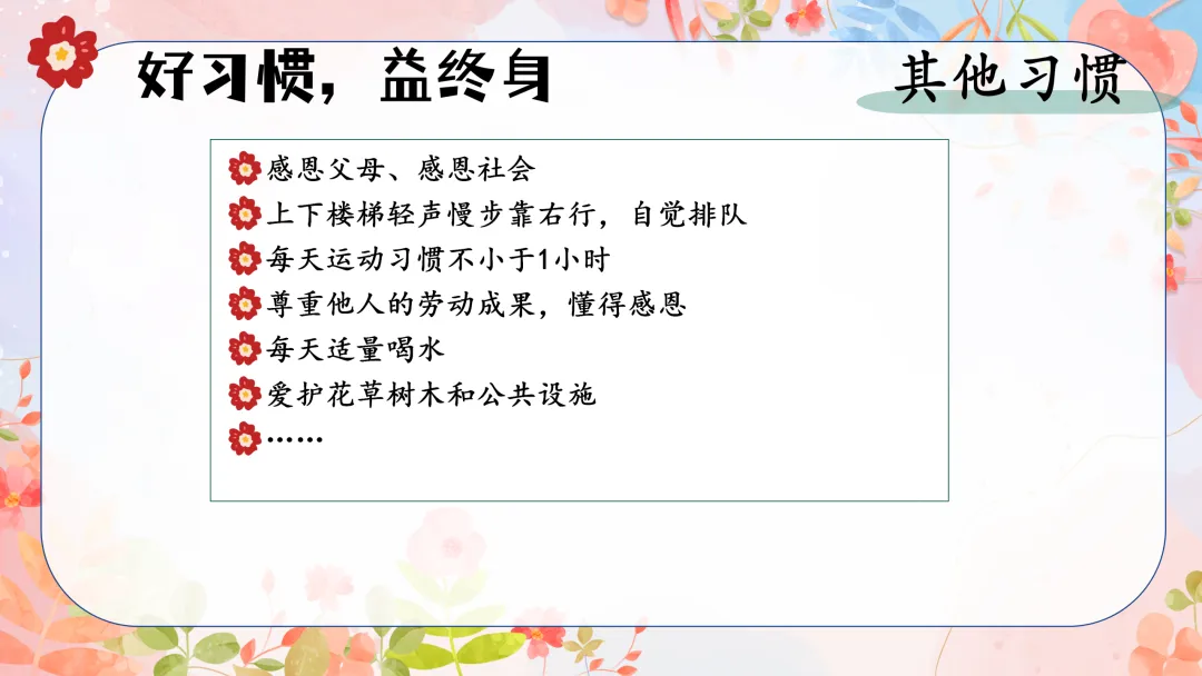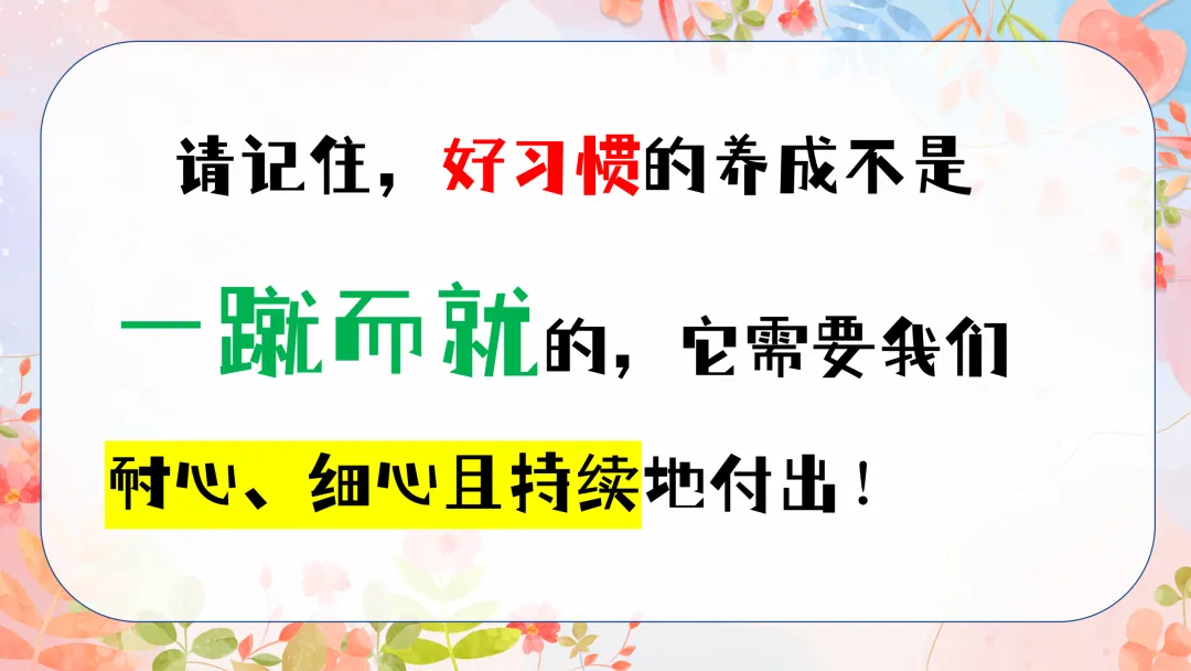 所以,今天我想和大家重点分享一下,如何帮助我们的孩子在小学一年级就养成那些能够受益终生的好习惯。这不仅包括学习习惯,还包括生活习惯、交友习惯、健康习惯、行为习惯、其他习惯。因为只有全方位地培养孩子的良好习惯,我们才能为他们打下坚实的人生基础。