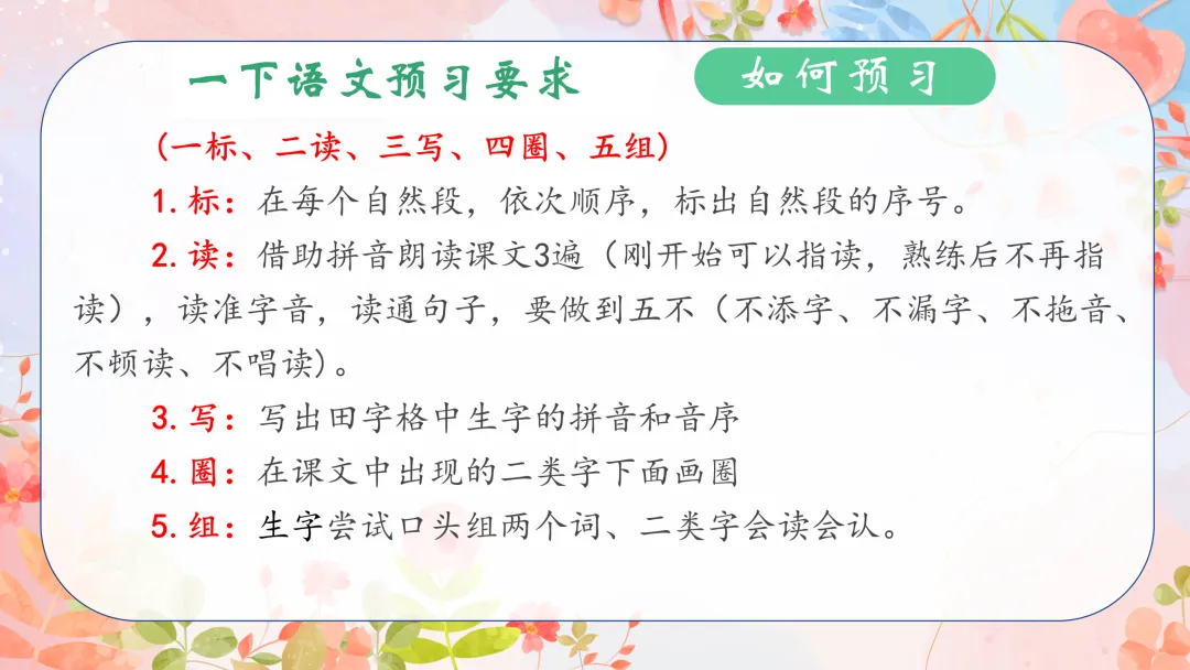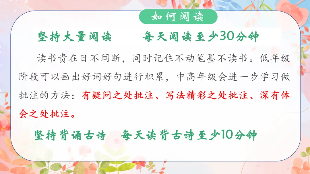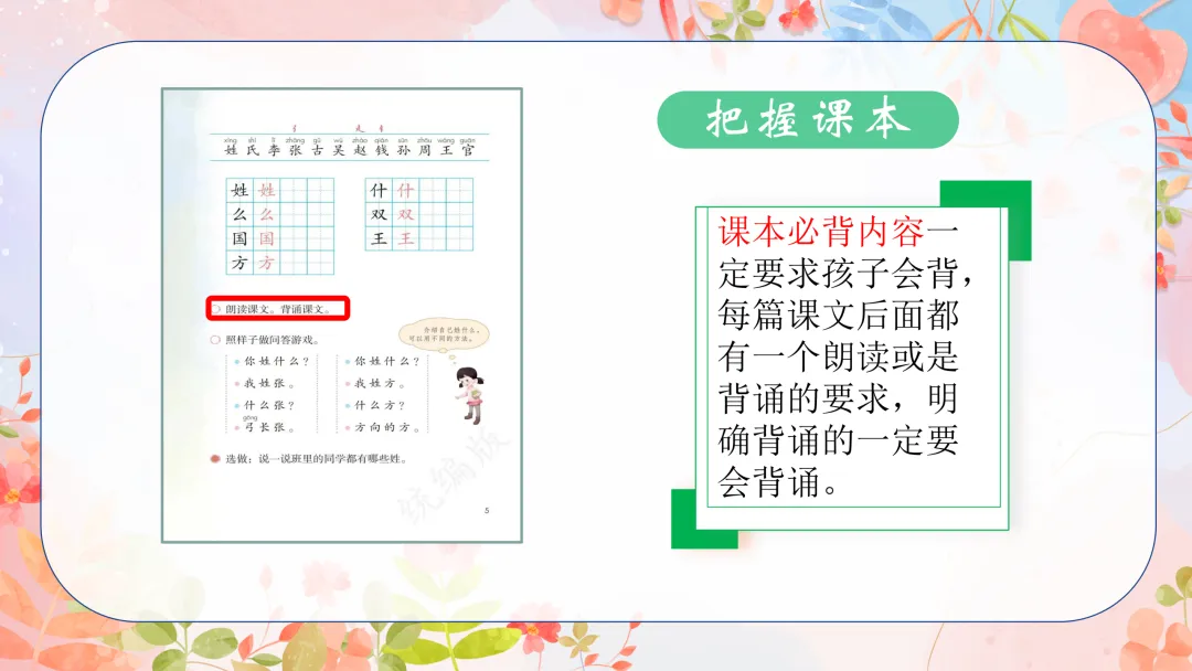 ①课本必背内容一定要求孩子会背,每篇课文后面都有一个朗读或是背诵的要求,明确背诵的一定要会背诵。