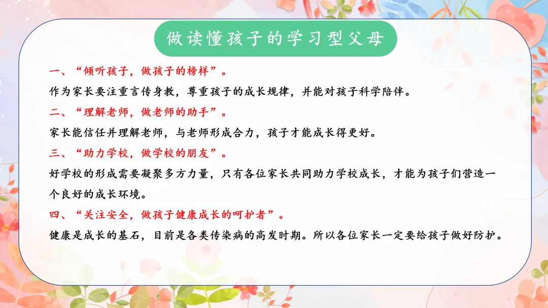 今天的家长会以“循序而上“习惯”成花”为主题,主要从以下几个方面展开: