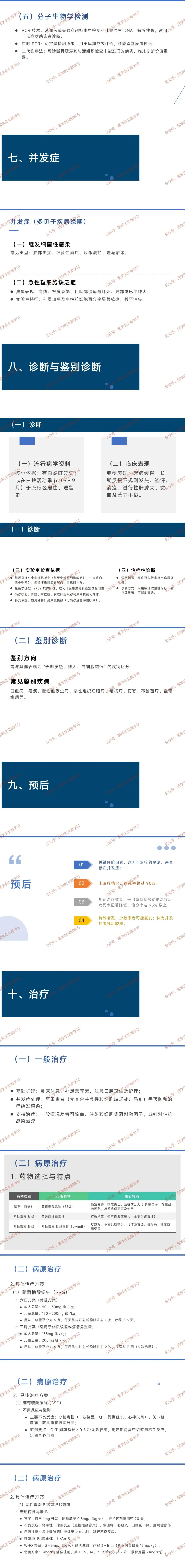 - 流行特征:全球 90% 病例集中在印度、苏丹等国,我国新疆、甘肃等西部 6 省有流行;无明显季节性,男性、农村人群多见,不同疫区高发人群不同(平原区青壮年、山区儿童、荒漠区婴儿)。