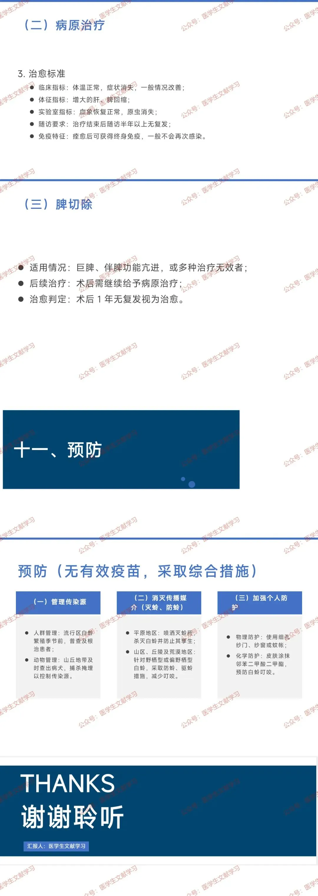 - 脾切除:适用于巨脾、脾功能亢进或多种治疗无效者,术后需继续病原治疗。