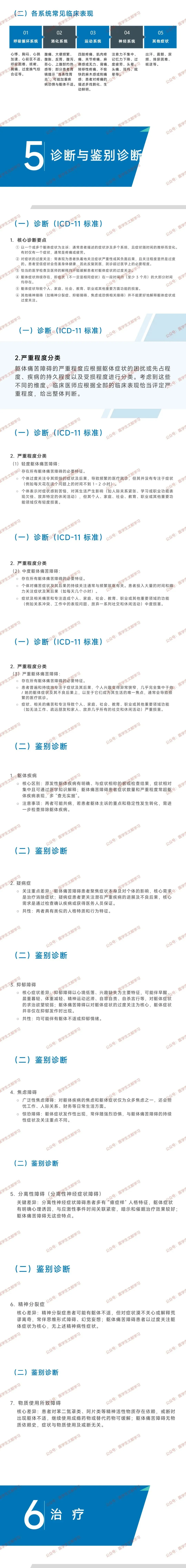 - 预后判断:急性起病、有明确精神心理诱因者预后好;起病缓慢、病程≥2 年者预后差。