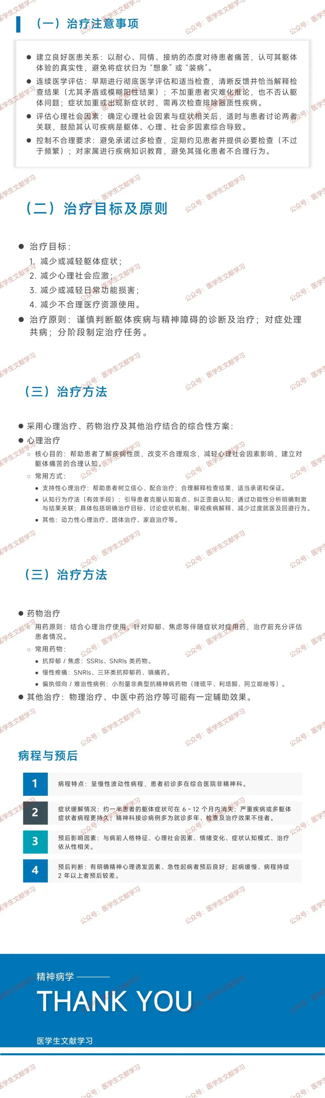 - 诊断特点:非精神科诊断含糊(如 “自主神经功能紊乱”),模糊诊断或假阳性结果会强化疾病感。