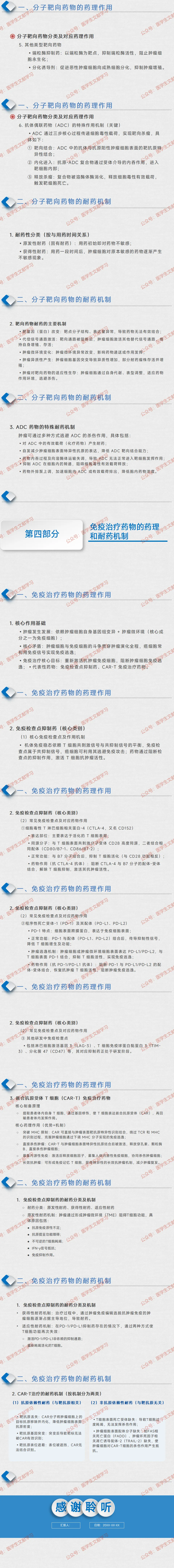 免疫检查点抑制药耐药:分原发性、获得性、适应性耐药;机制包括抗原免疫原性不足、抗原提呈障碍、T 细胞耗竭、IFN-γ 信号抵抗、替代抑制通路激活。